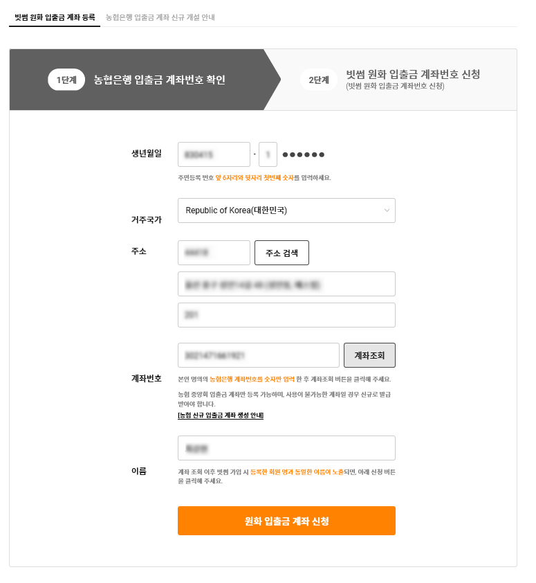 농협 입출금 계좌가 없을시 계좌 등록의 오른쪽 탭 "농협은행 입출금 계좌 신규 개설 안내"를 클릭하여 농협은행 방문없이 비대면(온라인)으로 계좌 개설이 가능하다. 비대면 계좌개설 필요서류는 신분증(주민등록증 또는 운전면허증), 본인명의 휴대폰, 본인명의 타행 계좌정보이다. 이미 농협은행 계좌가 있거나, 신규 계좌 개설을 하였다면 "빗썸 원화 입출금 계좌 등록"을 계속해서 진행하도록 한다.