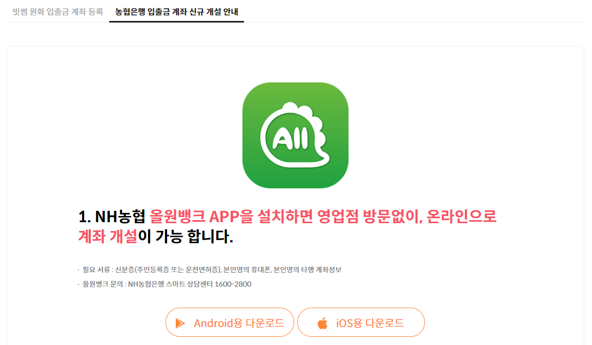 농협 입출금 계좌가 없을시 계좌 등록의 오른쪽 탭 "농협은행 입출금 계좌 신규 개설 안내"를 클릭하여 농협은행 방문없이 비대면(온라인)으로 계좌 개설이 가능하다.  비대면 계좌개설 필요서류는 신분증(주민등록증 또는 운전면허증), 본인명의 휴대폰, 본인명의 타행 계좌정보이다. 이미 농협은행 계좌가 있거나, 신규 계좌 개설을 하였다면 "빗썸 원화 입출금 계좌 등록"을 계속해서 진행하도록 한다.