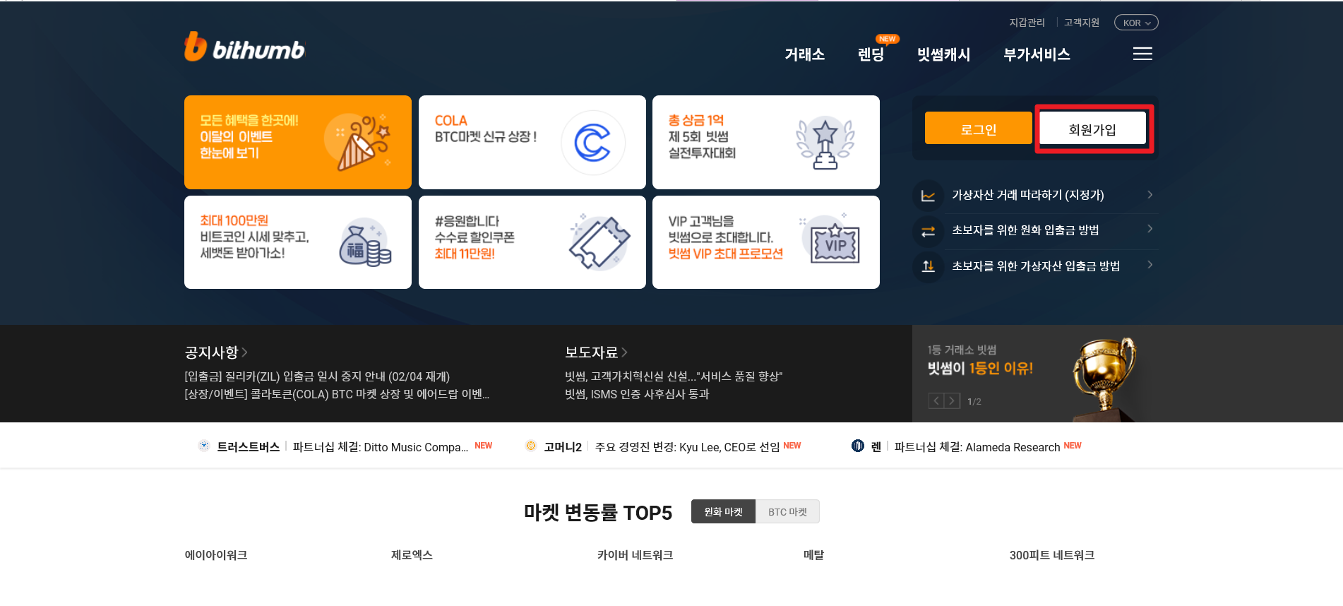 네이버 or 다음과 같은 포털 사이트의 검색창에 "빗썸"을 검색하여 홈페이지에 들어간다. 홈페이지의 회원가입으로 클릭하여 들어간다.