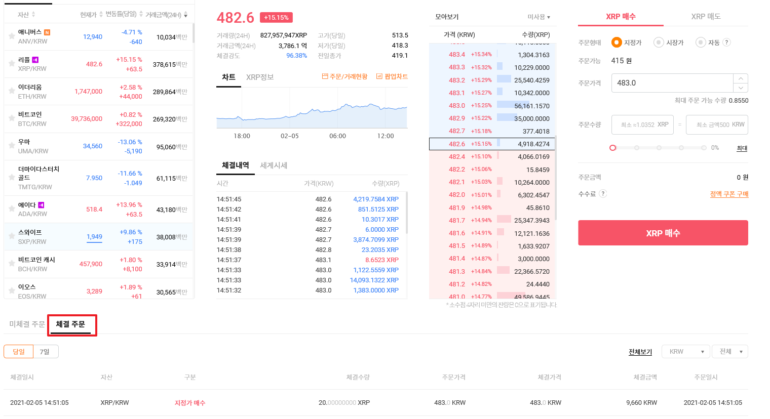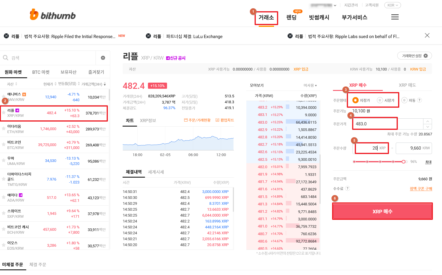 화면왼쪽을 보면 비트코인과 리플, 비트코인 캐시 등의 종목이 보인다. 이 중에서 원하는 종목을 선택 후 지정가(내가 원하는 매수 금액을 입력 후 입력한 금액이 오면 체결된다.) or 시장가(현재 시세의 금액으로 바로 체결된다.) 설정. 지정가로 매수하기로 했으면 주문가격을 입력하고 다음 주문 수량입력 후 하단의 XRP 매수 클릭한다.