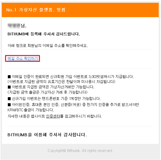 빨간 박스되어있는 "메일 주소 확인하기" 클릭하면 회원가입이 완료가 되며 빗썸으로 연결이 된다.