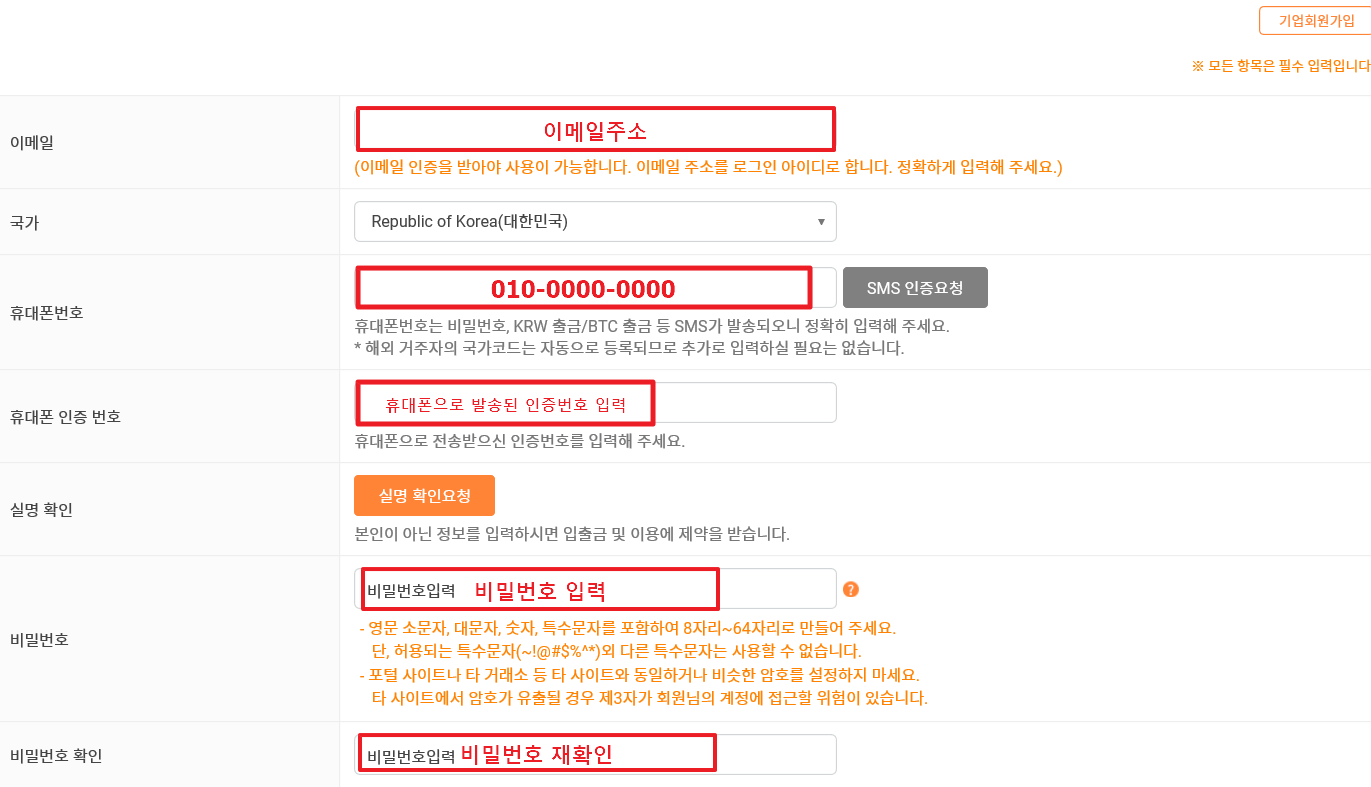 회원가입으로 들어가면 위와 같은 화면이 뜨고 모든항목 필수 입력 사항으로 입력 해주면 된다