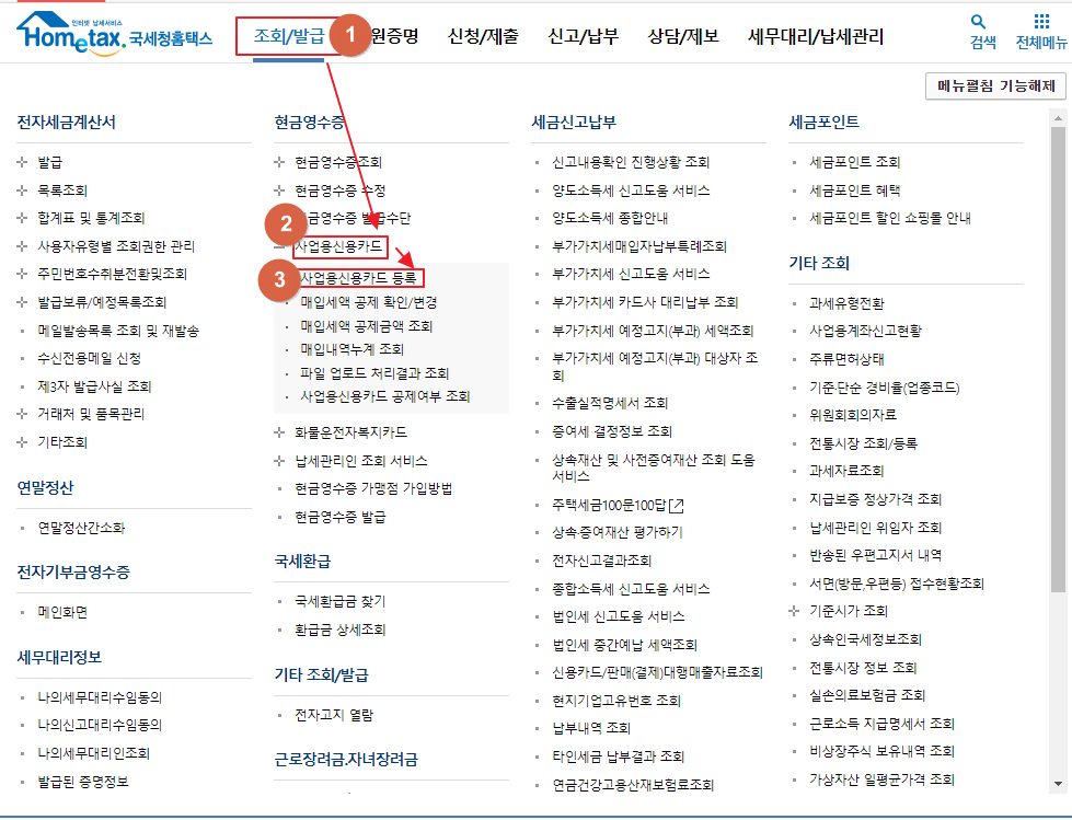 조회/발급 -> 사업자용신용카드 -> 사업용신용카드등록 순서로 클릭해서 들어간다.