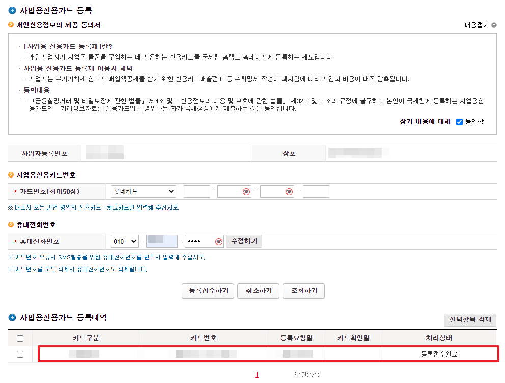 동의함 체크박스에 체크를 클릭한 뒤 등록할 카드번호와 본인의 휴대전화번호를 입력한다. 그리고 아래에 있는 등록접수하기 버튼을 클릭한다.