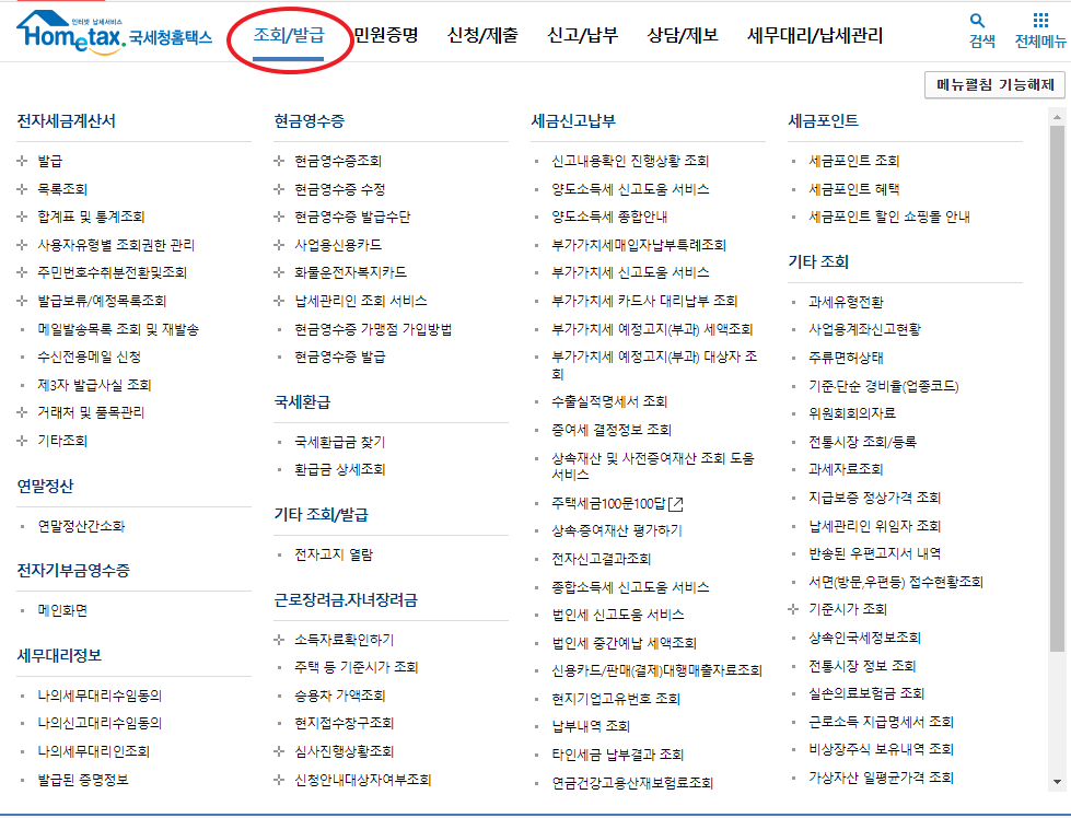 홈페이지 접속 후 로그인을 하고 상단 메뉴바에서 조회/발급을 찾는다.