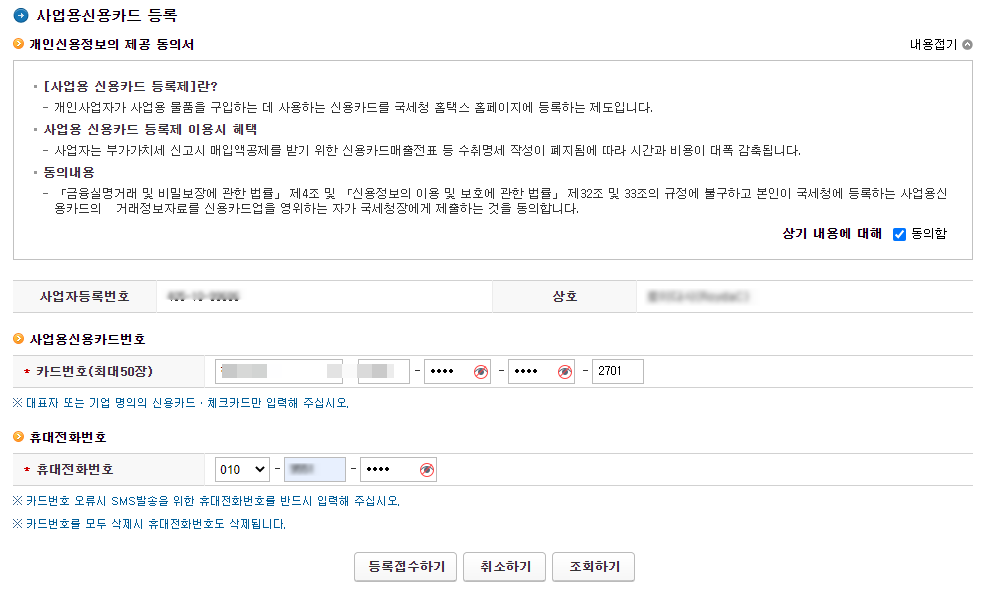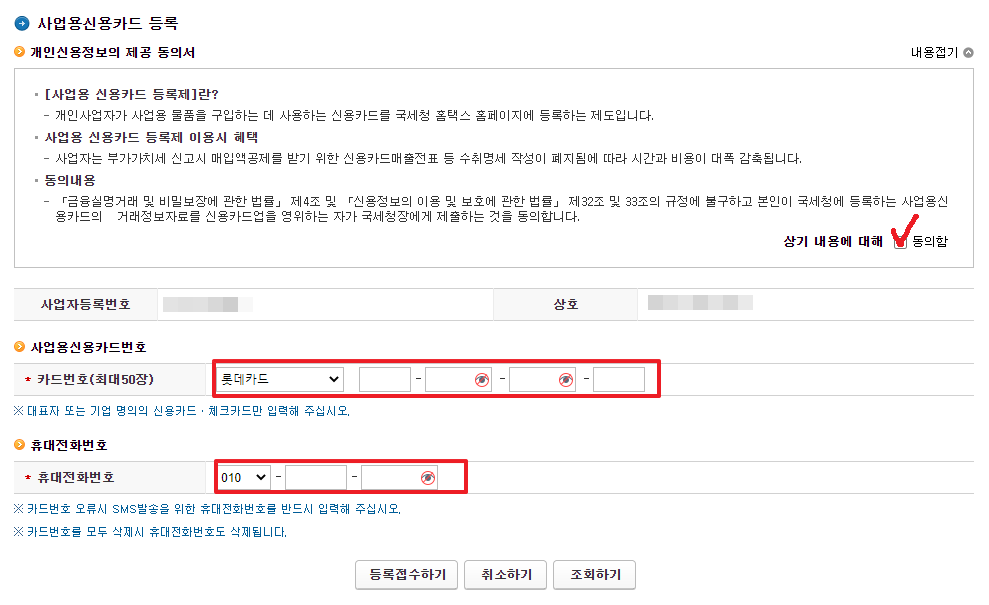 동의함 체크박스에 체크를 클릭한 뒤 등록할 카드번호와 본인의 휴대전화번호를 입력한다. 그리고 아래에 있는 등록접수하기 버튼을 클릭한다.