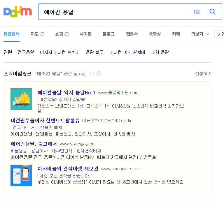 포털 다음에서 '에어컨 용달' 검색 화면