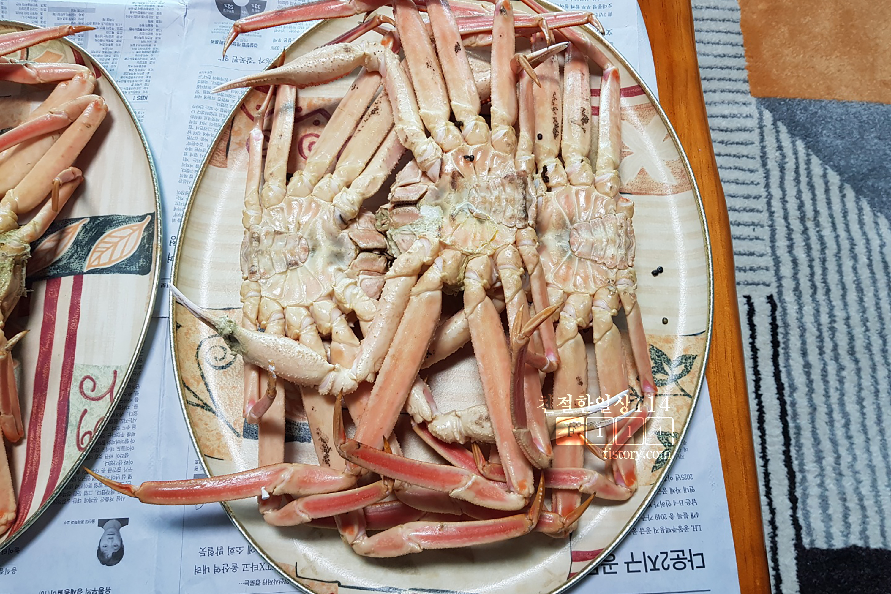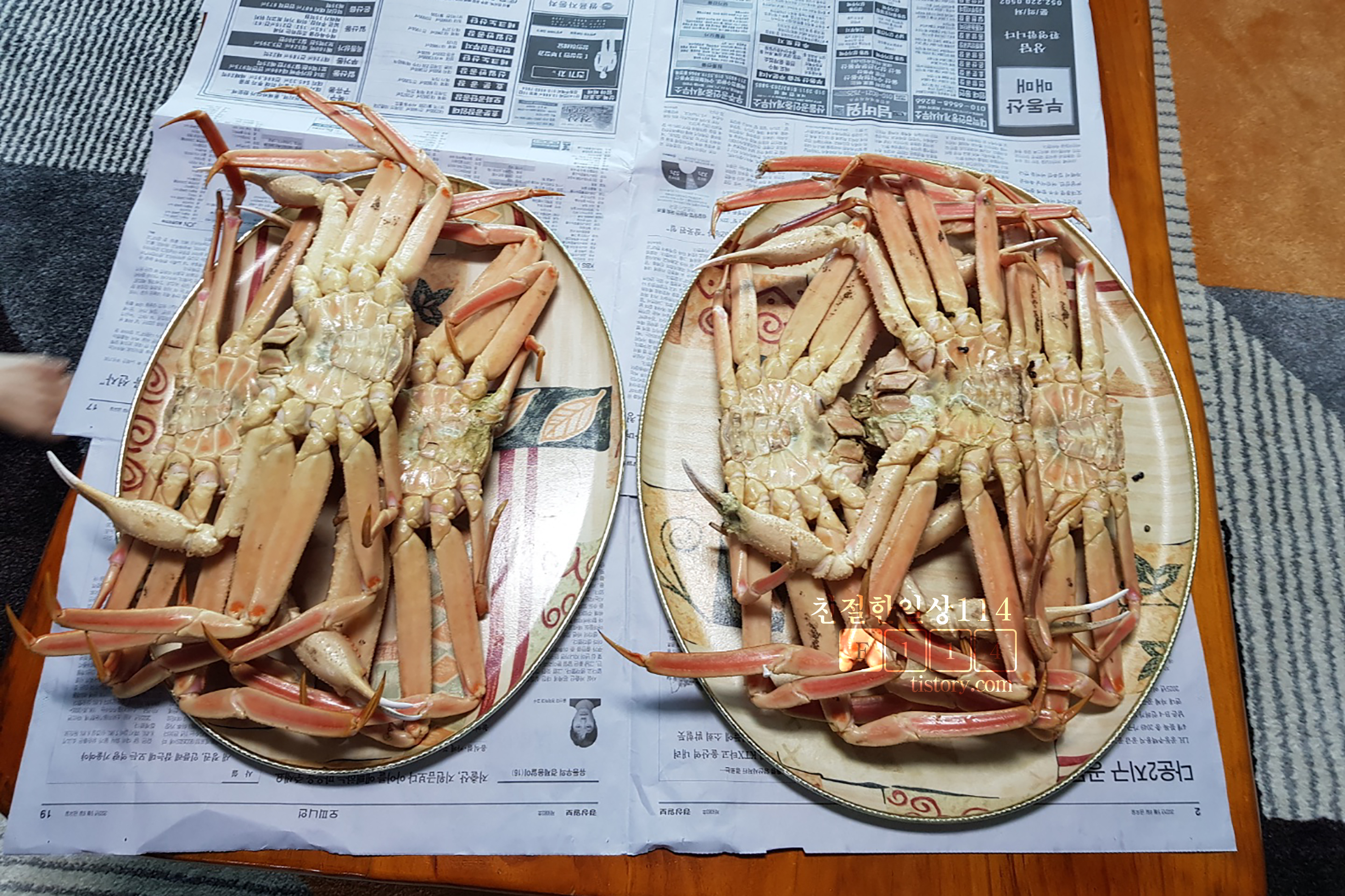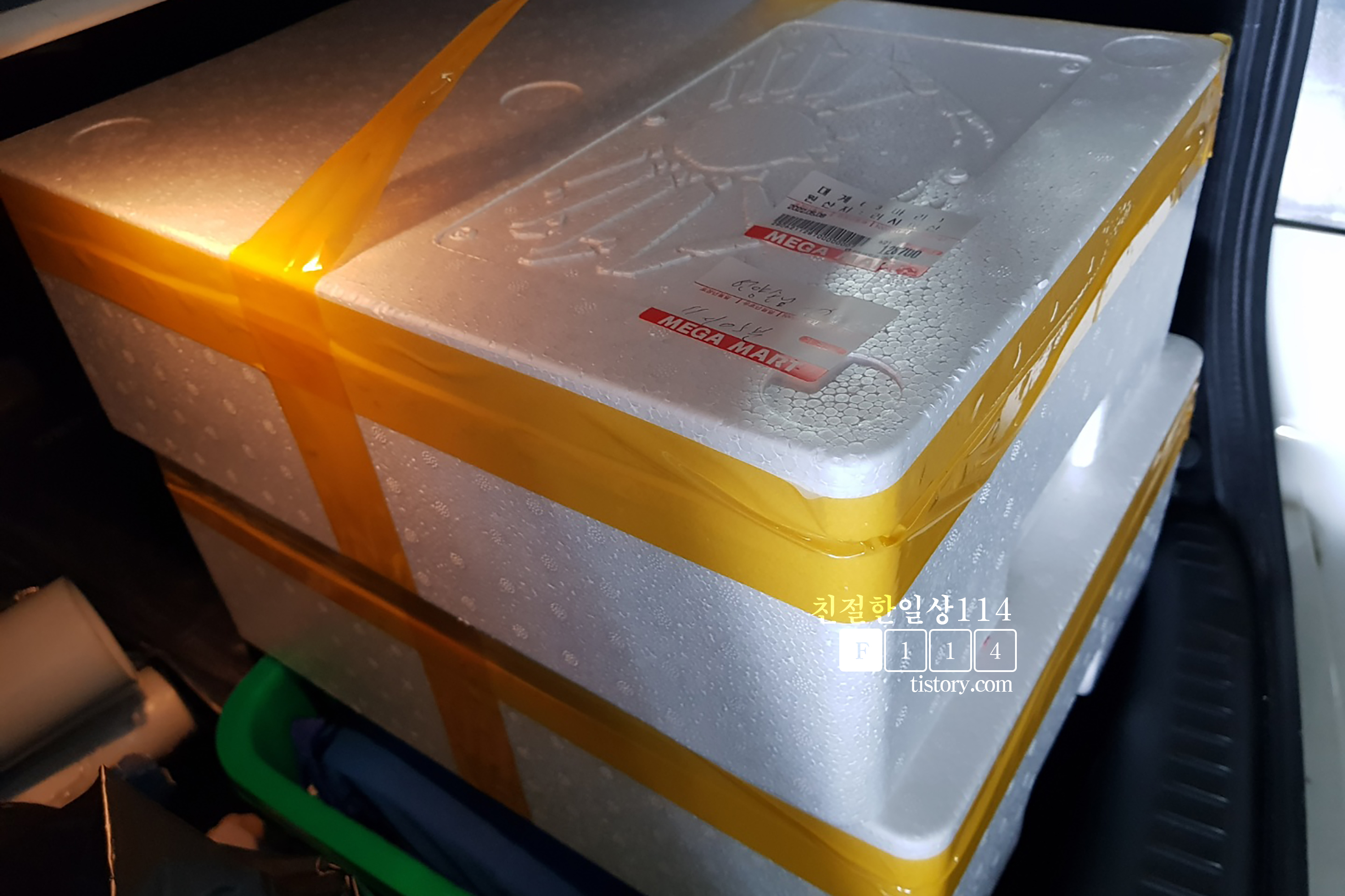 마트에 도착하니 찜기에서 대게가 쪄지고 있는지 김을 내뿜고 있다. 전화주문 했다고 하니 방금 포장해 뒀다며 앞에 있는 스티로폴 2상자를 주신다.