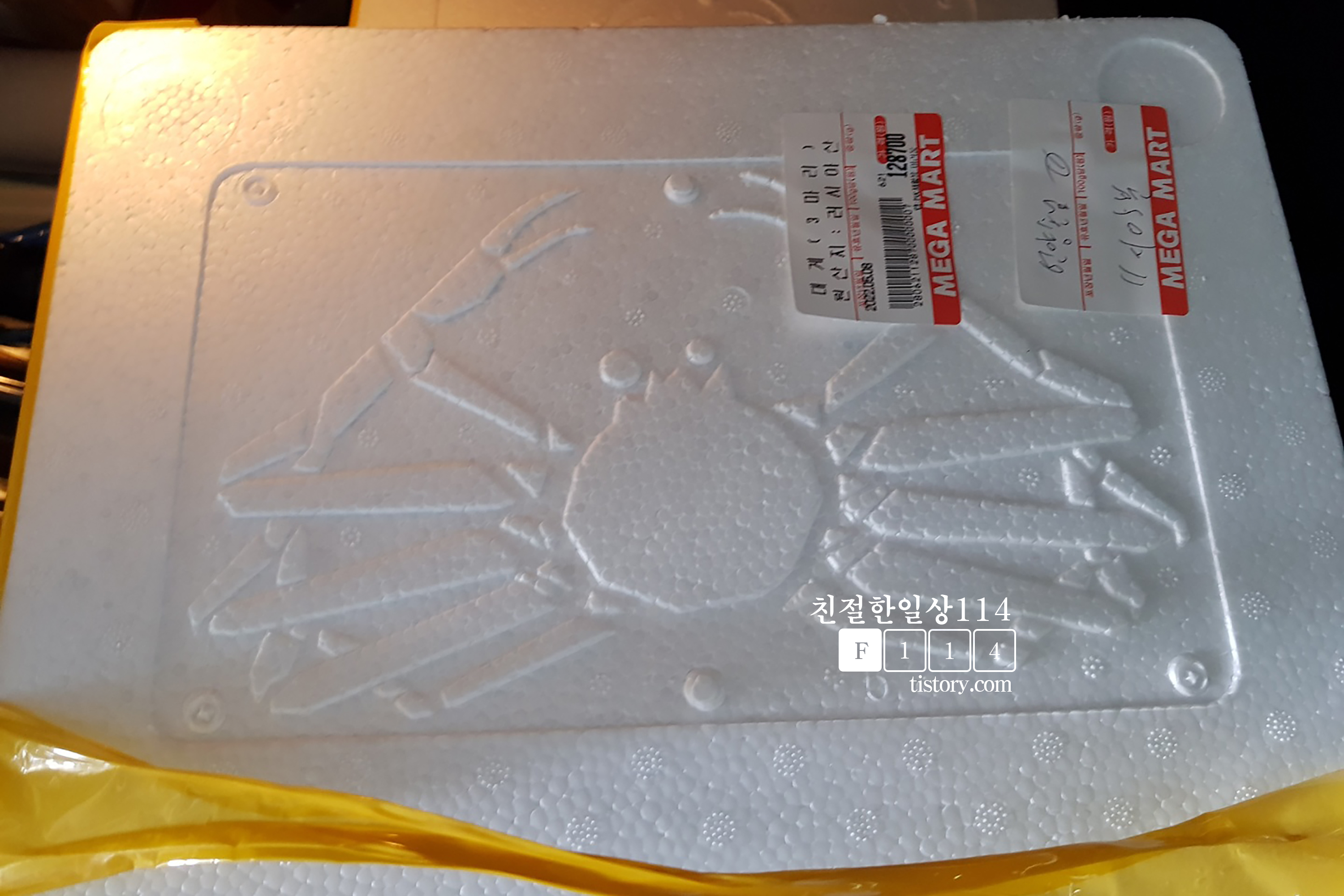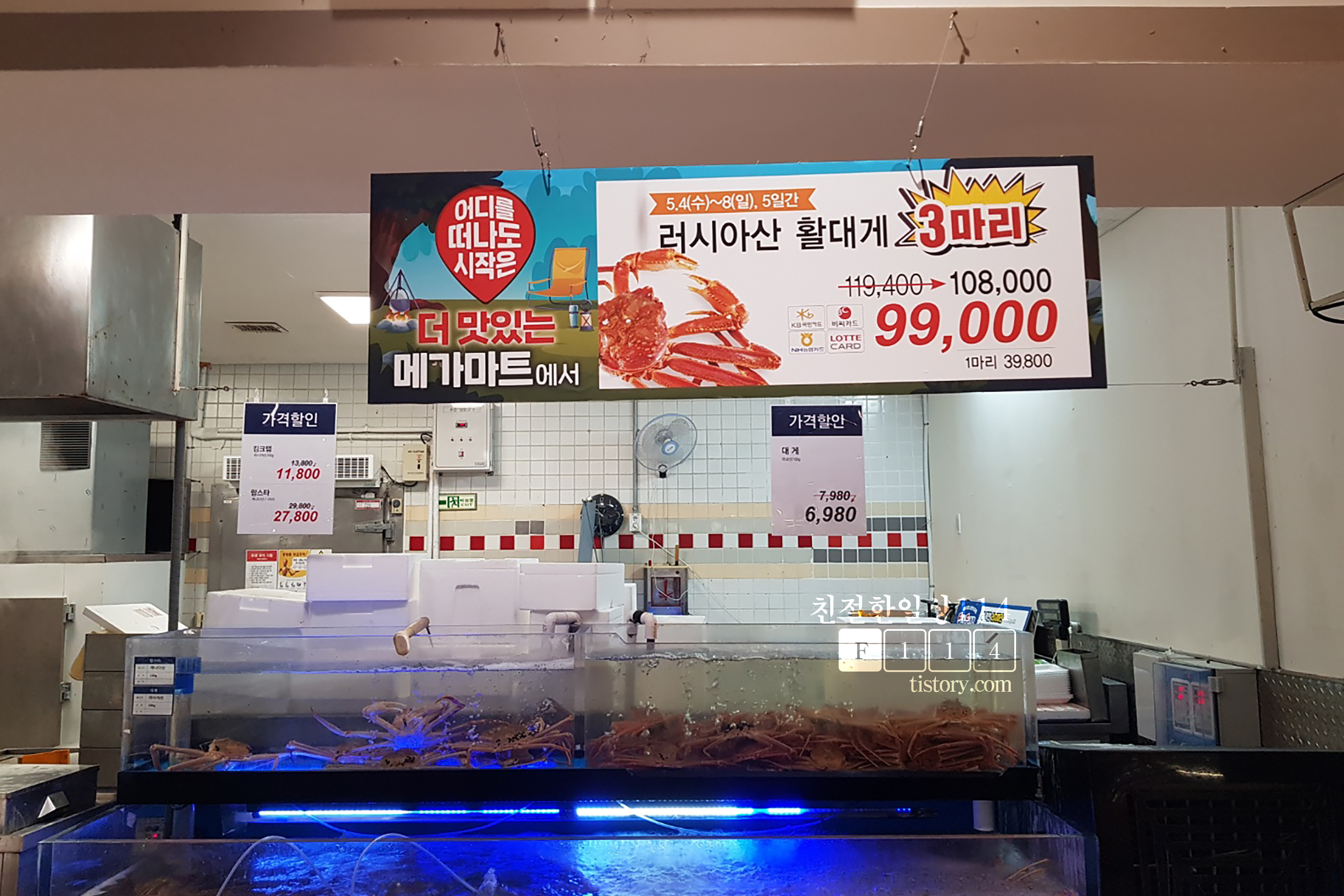 아이 장난감 선물을 사기 위해서 가까운 메가마트에 들렸다가 수산코너에서 대게 할인 행사중인것을 보았다. 1마리에 39,800원! 3마리에 99,000원!! 얼마전 울산 진장동에 회센터가 새로 생겨서 갔을 때 당시 대게 시세가 1마리에 93,000원 이었으니 1마리 가격으로 3마리를 살 수 있는 겪이다.