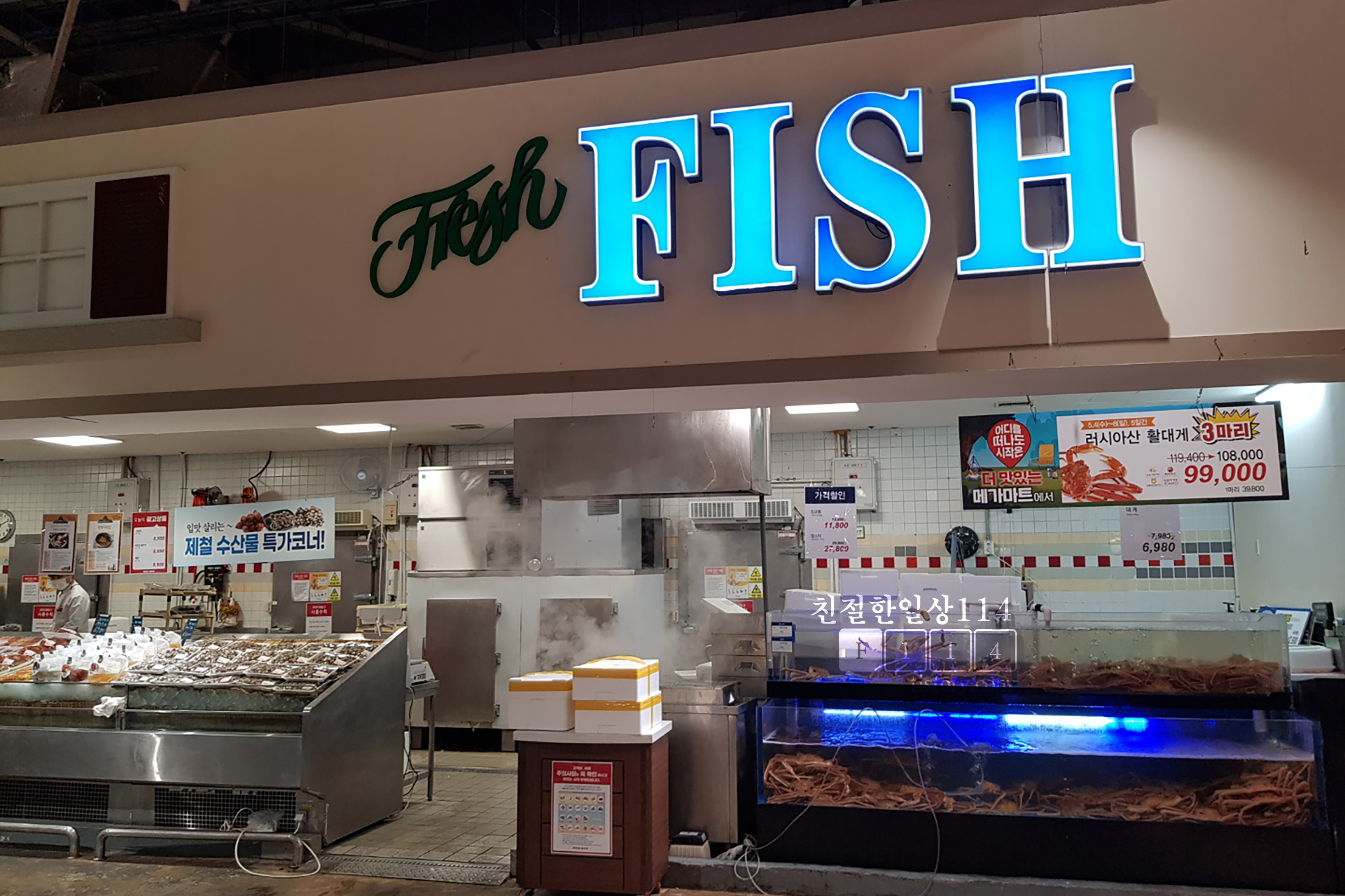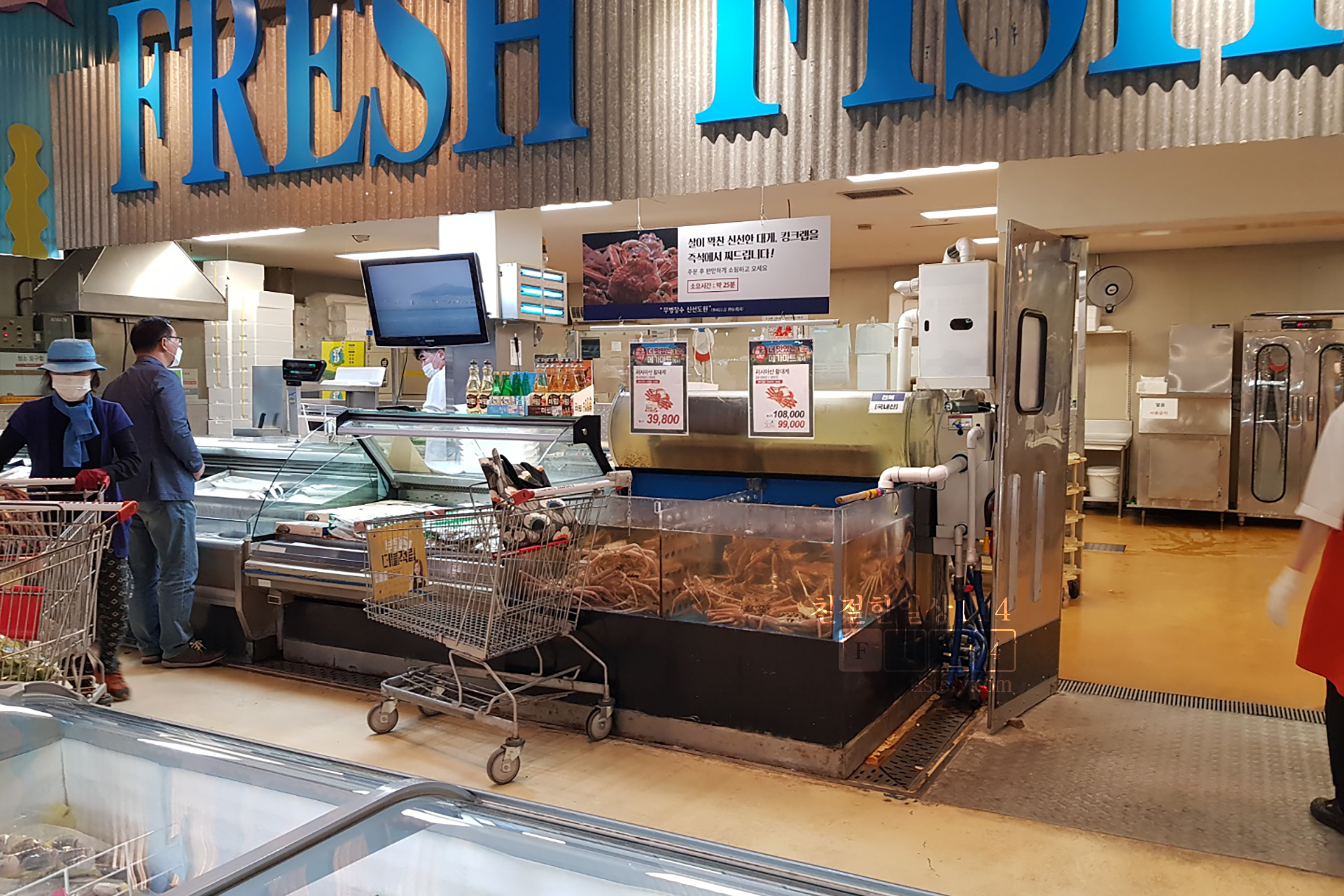 수산코너 판매자 분이 메가마트에서 대게 행사를 하게 된 배경을 얘기해 주신다. (물어보지는 않았지만 필자가 설명해주고 싶게 생겼는가 보다) 이번에 대게 수입업자들이 국내 소비 대게를 많이 확보해 뒀는데 거기에 중국으로 대게가 못 들어가게 되면서 중국 물량까지 우리나라로 들어와 대게 가격이 떨어졌다고 한다.