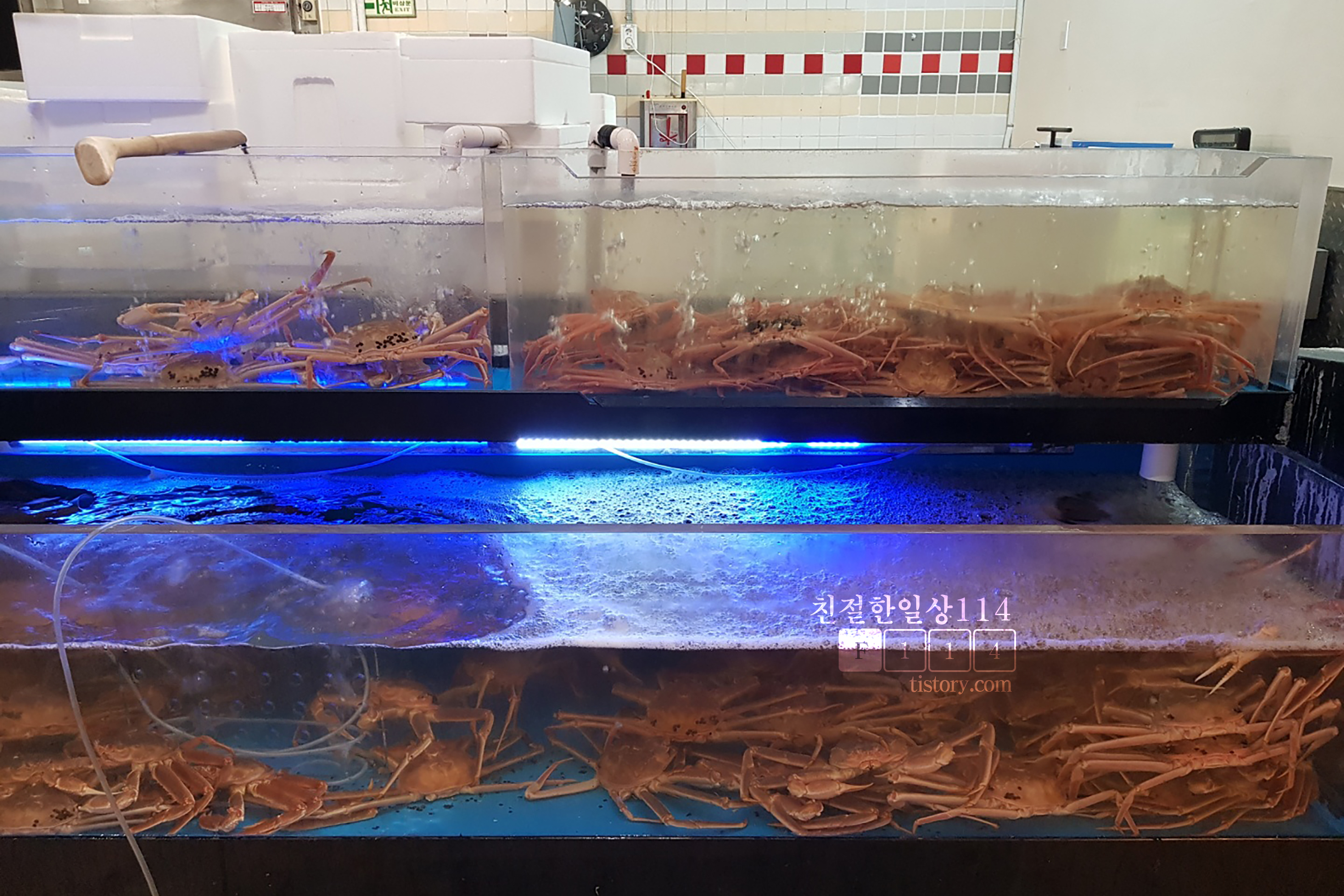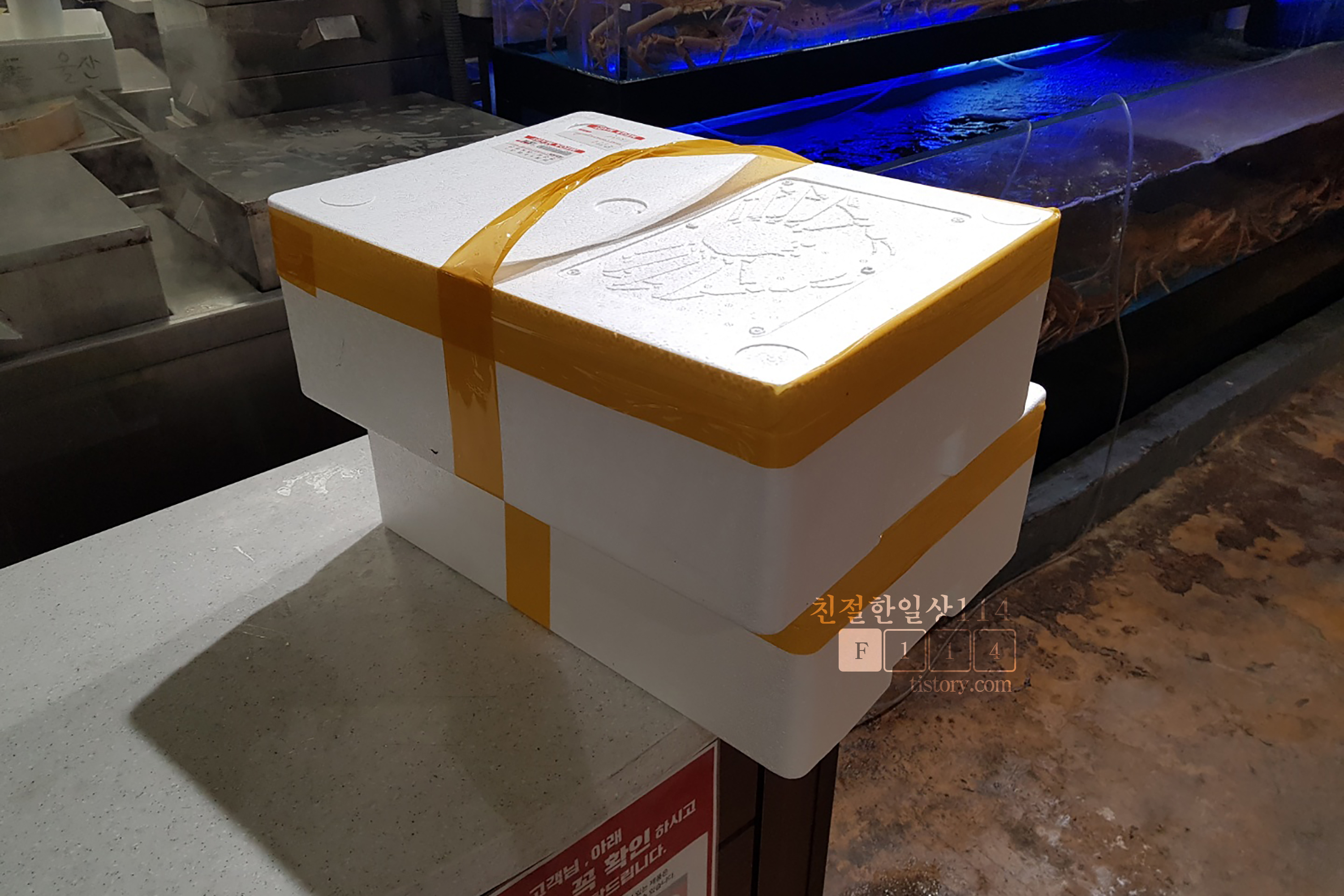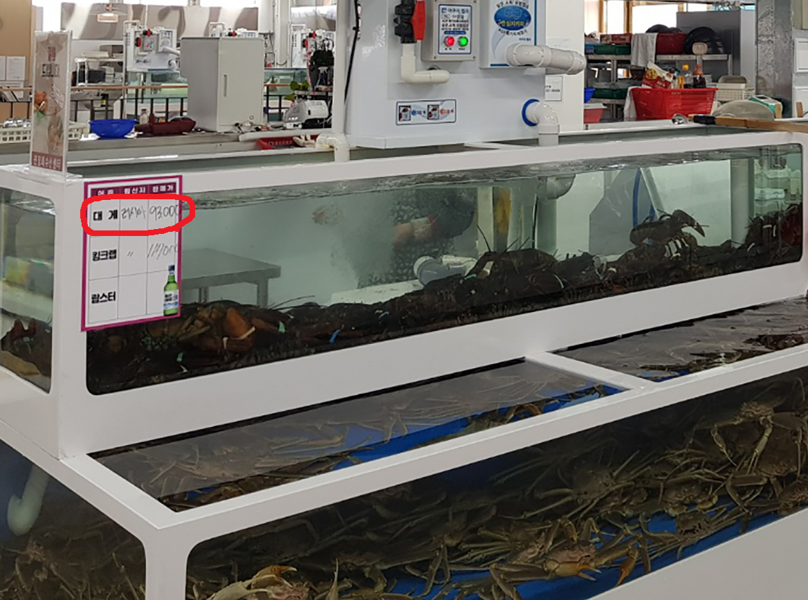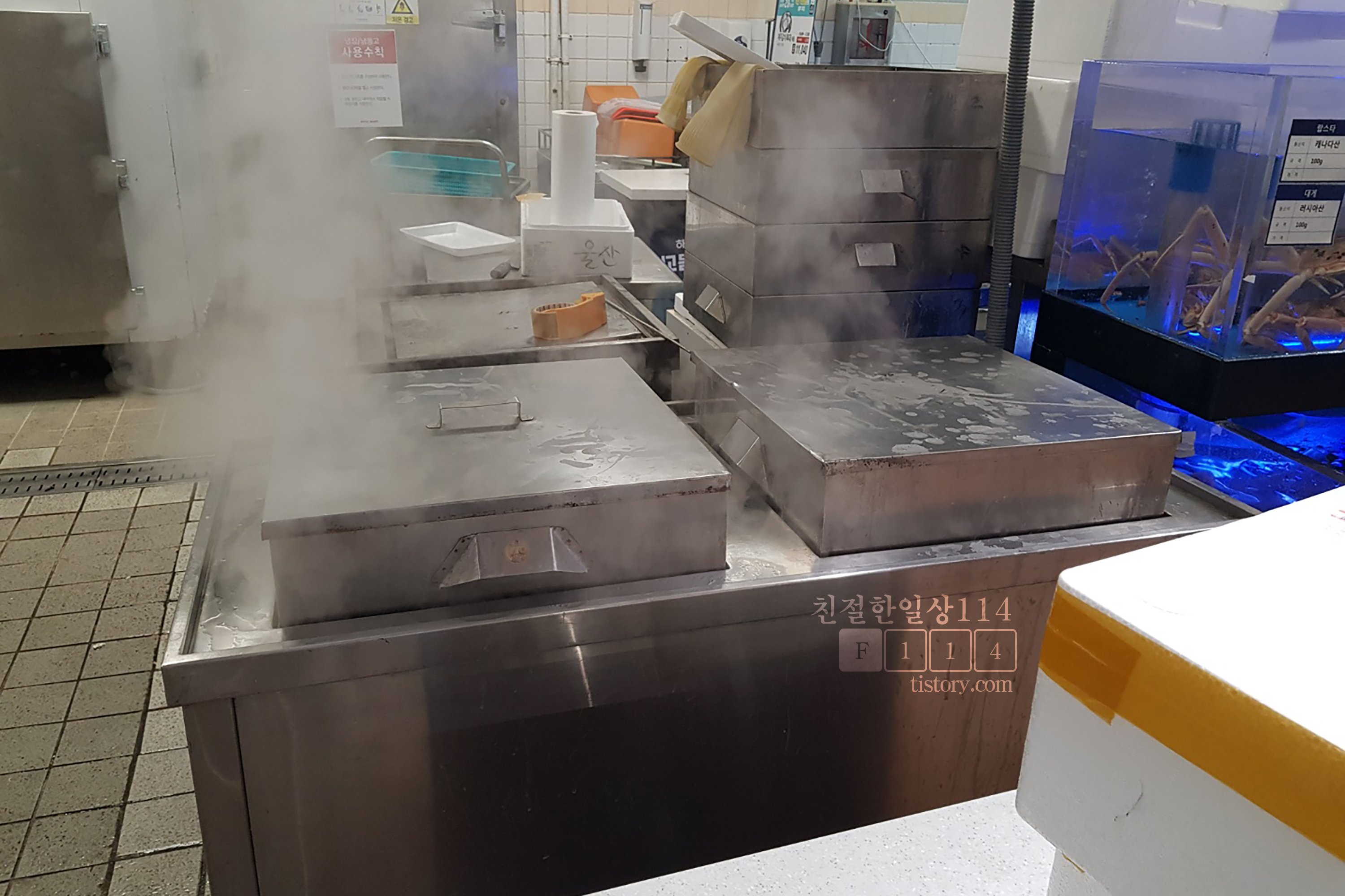 수산코너 판매자분께서는 필자와 같이 전화주문하는 손님을 위해서 대게를 찌기전에 대게 사진을 찍어서 보여주었다. 그러면서 큰 녀석중에 다리가 적게 떨어진것으로 골라서 쪘다고 설명해주신다. 수율은 어느정도 되는지 여쭤보니 70~80% 정도 된다고 한다.
