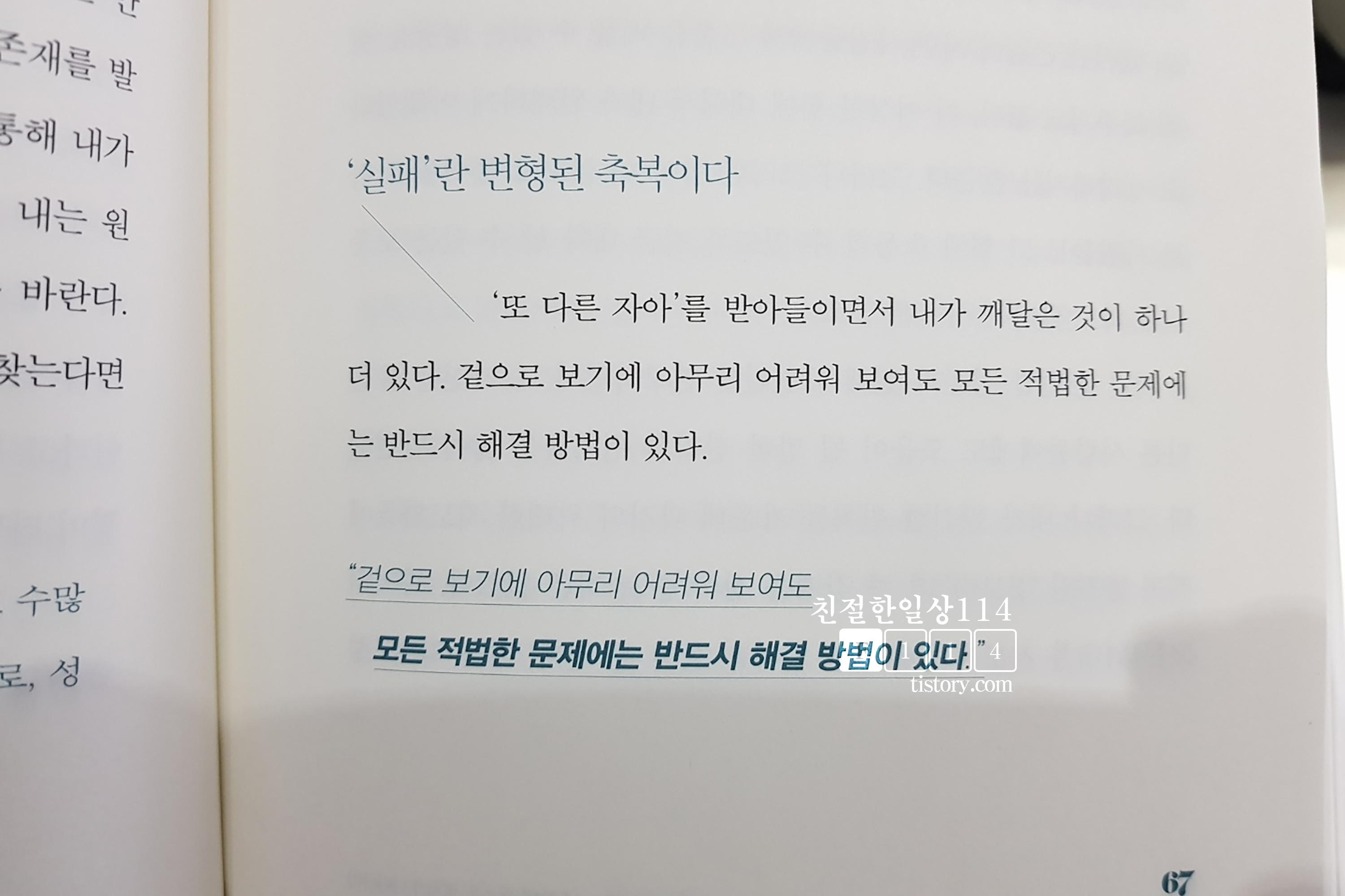 실패를 온전히 받아들이면 말 그대로 실패인 것이다. 낙담하고 실패했다고 생각하는 순간 거기서 머물고 주저앉게 된다. 해결방법을 찾아 나아가면 실패는 과정이 되고 성공의 씨앗이 된다. 한없이 좋기만 한 일이 없고, 한없이 나쁘기만 한 일도 없다. 모든 일에는 장단점이 있다. 나쁜일이 있을때 낙심하거나 화내며 현재에 머물러 있지 말고 해결방법을 찾아서 나아가 좋은일로 바꿔나가려는 의지가 필요하겠다.