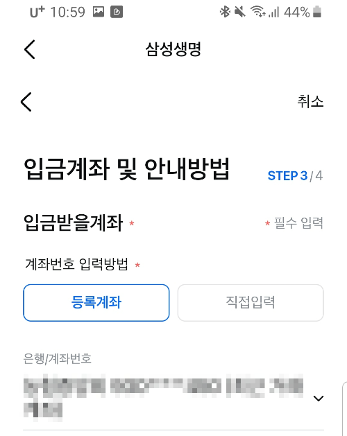 보험금을 받을 계좌를 확인하는 단계이다. 이전에 받은 적이 없다면 본인의 계좌를 입력하면 된다.