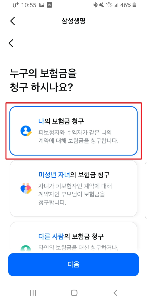 보험금 청구 대상이 본인, 다른 가족이나 자녀인지를 선택할 수 있다. 본인의 보험금이기에 '나의 보험금 청구'를 선택한다.