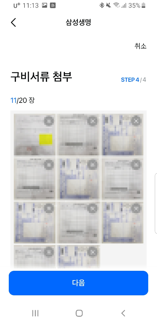 서류는 한번에 최대 20장까지 첨부할 수 있다. 미리 촬영해 둔 서류를 한 번에 업로드한다.