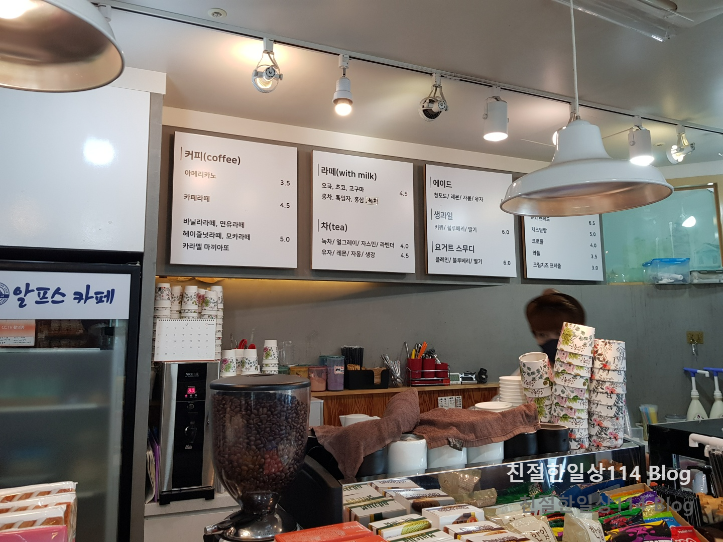 알프스 카페 판매중인 메뉴. 여러종류 커피와 차, 에이드, 생과일, 요거트스무디 등의 마실 거리가 있다.