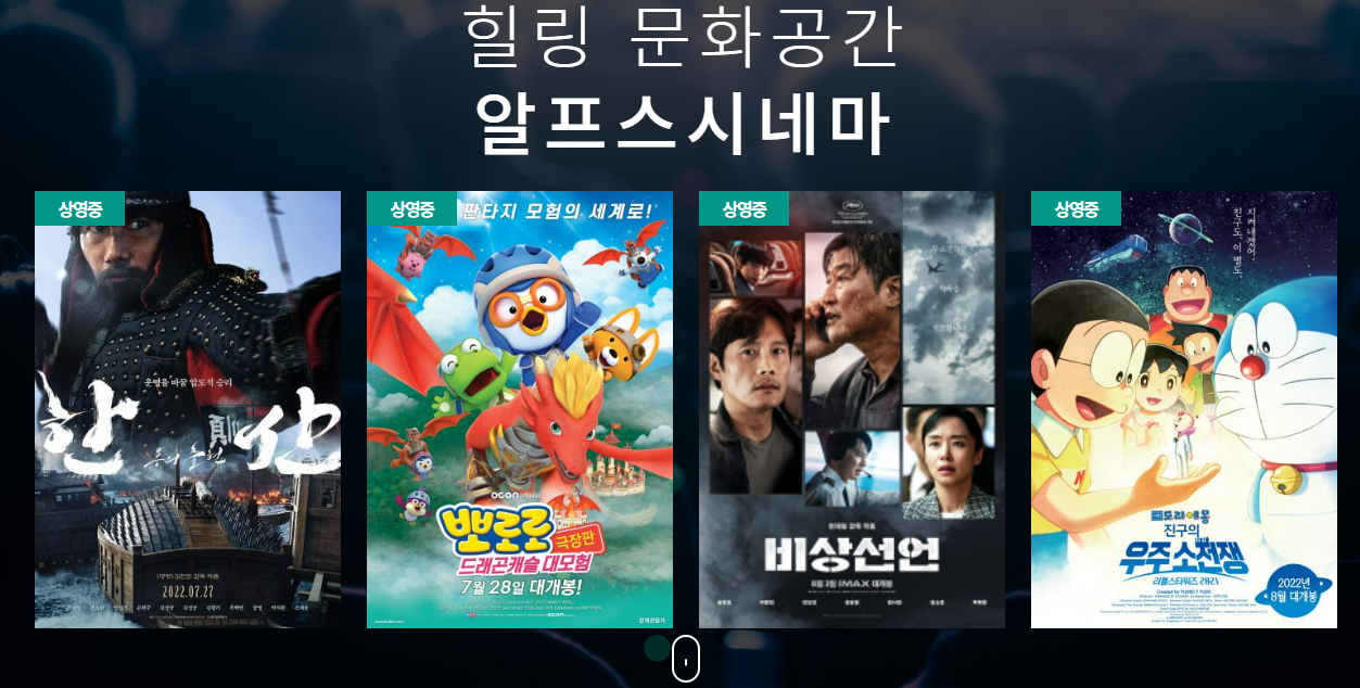 알프스시네마 현재 상영작 확인 및 티켓예매가 가능한 링크를 아래에 걸어둔다.