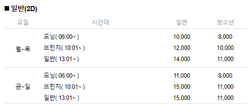 2D 영화 기준으로 평일 모닝 1만원 ~ 주말 일반 15,000원까지 한다. CGV에서도 할인 적용을 한다고 하더라도 3명 가족이 영화를 본다면 3만원은 훌쩍 넘길 것 같다.