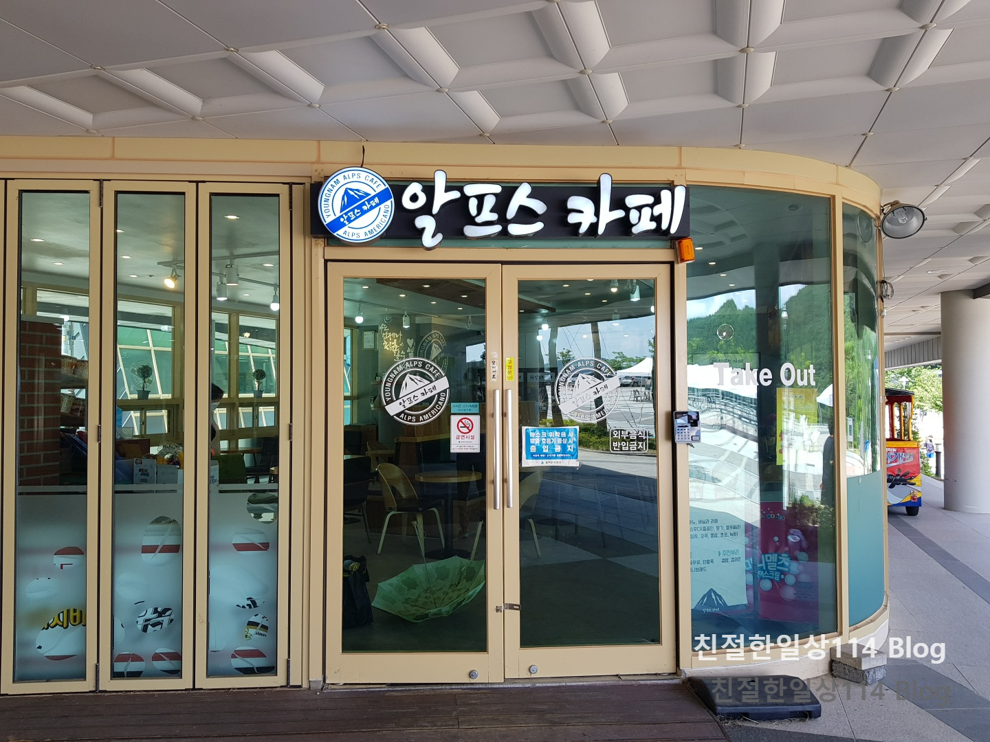알프스 카페는 알프스시네마 1관이 있는 산악문화관 건물에 있다. 티켓교환을 한 건물을 빠져나와 다른 건물로 이동해야하지만 그리 멀지 않기에 알프스 산세를 구경하며 걸어간다.