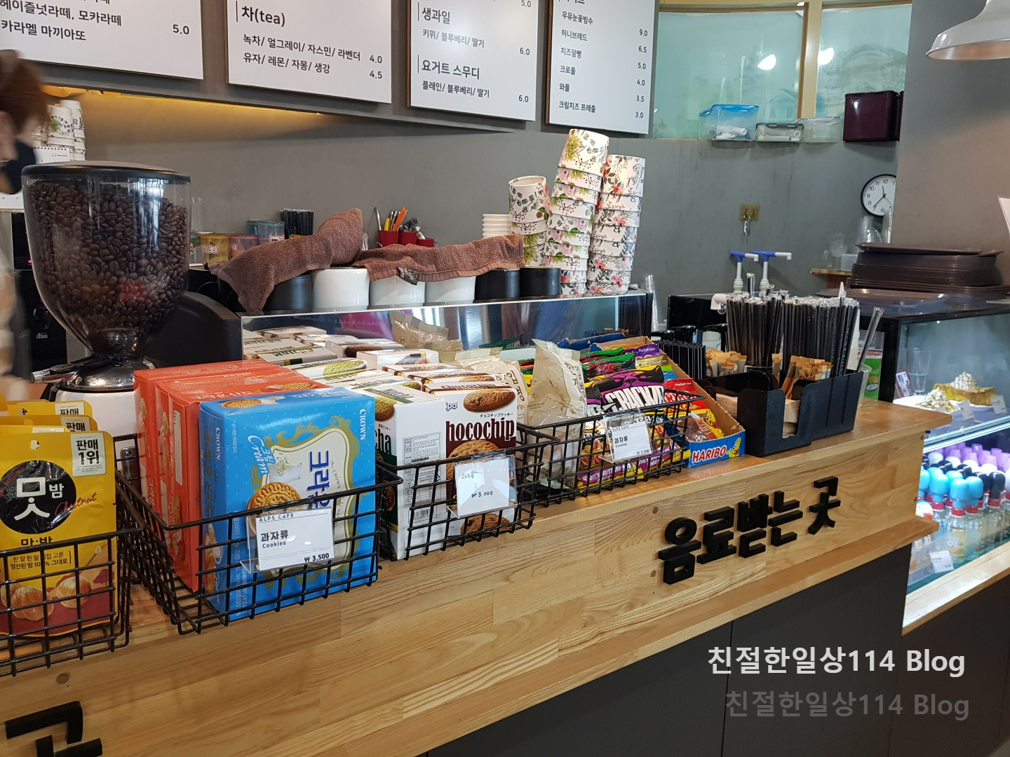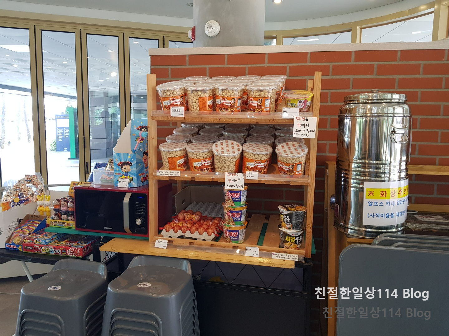 카운터 맞은편쪽에 팝콘과 삶은 계란, 컵라면 등이 진열되어있다. 날씨가 조금 선선해지면 산을 바라보며 먹는 컵라면이 참 맛있을 듯 하다.