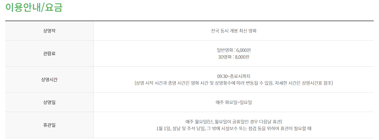 - 휴관일: 매주 월요일 휴관 (월요일이 공휴일인 경우 운영하며 다음날(화요일) 휴무)