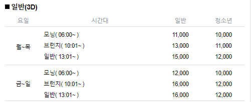 CGV에는 브런치라는 시간대 요금구간이 롯데보다 하나 더 있다. 그렇긴 해도 결국 영화관람료를 롯데시네마와 거의 같다고 보면 된다.