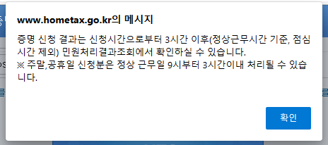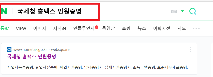 1. 포털사이트에서 '국세청 홈텍스 민원증명' 검색 및 클릭