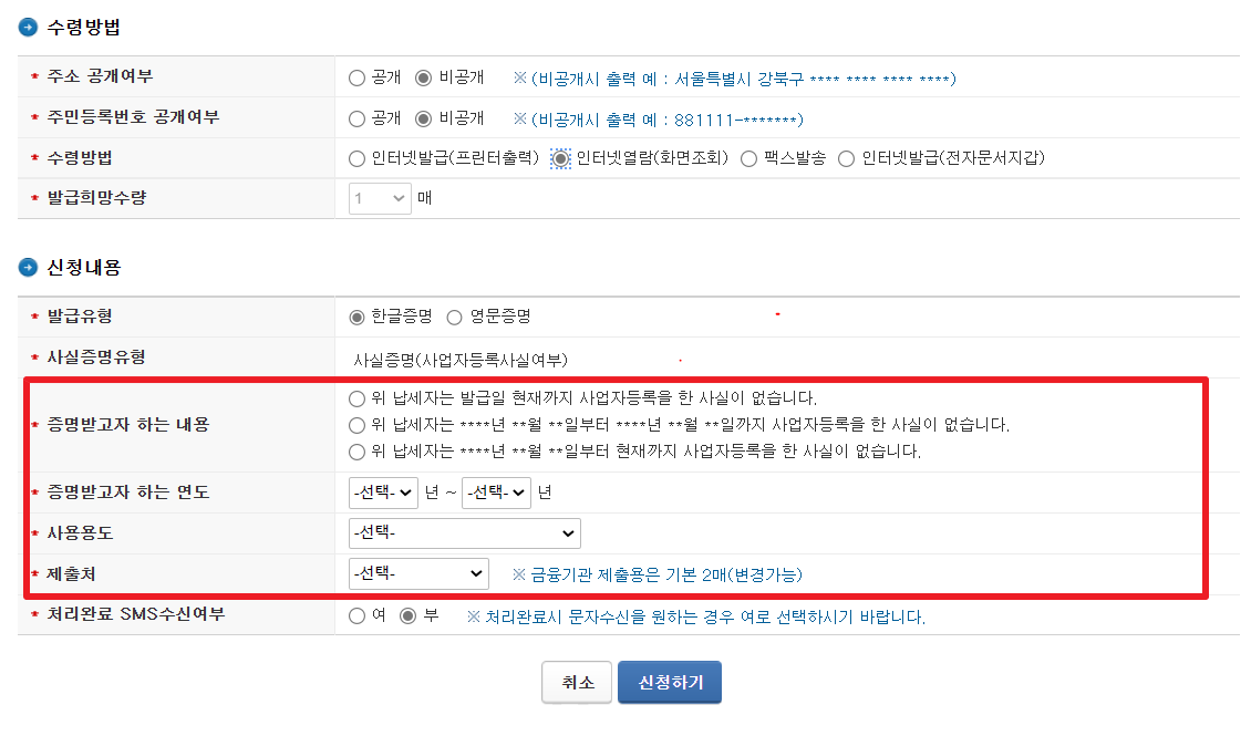 신청서 내용에 1번 기본인적사항은 로그인 정보에 있는 내용일 딸려온다. 2번 수령방법은 변경할 내용이 있으면 변경하면 되겠고 3번 신청내용에 내용/용도/년도/제출처 등의 내용을 본인에게 맞게 수정하고 아래의 '신청하기' 버튼을 클릭한다.