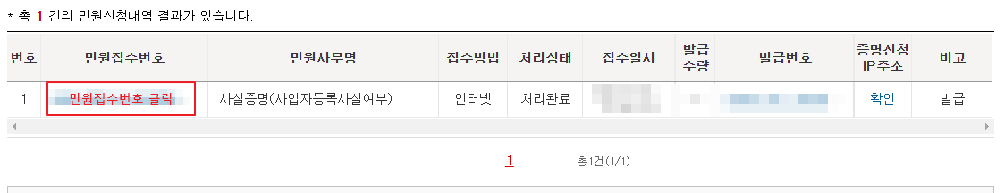 - 이후 약 1시간이 지나서 조회해보니 처리 완료로 되어있고 민원접수번호를 클릭하면 들어가서 서류를 볼 수 있다.