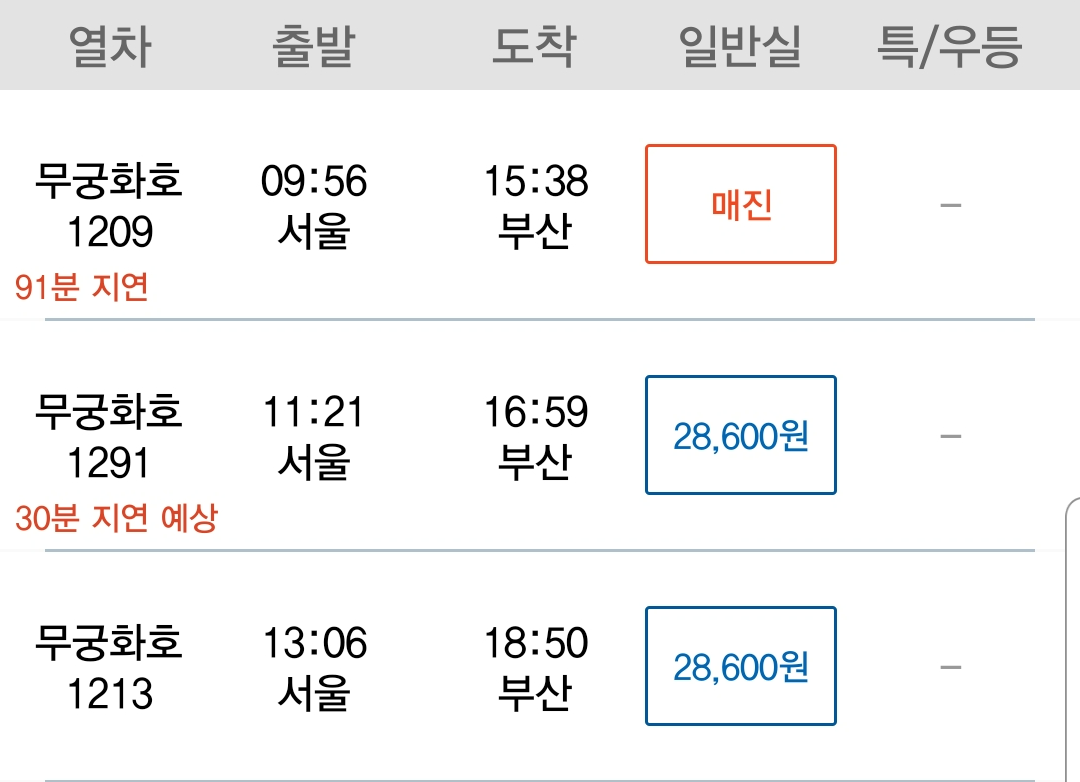 이번에는 일반기차인 무궁화호로 서울역에서 부산역까지 운임요금을 알아보자.
