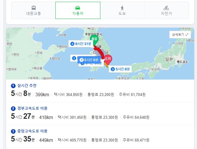 먼저 자동차로 서울역 -> 부산역 이동시 들어가는 비용을 계산해 보자.