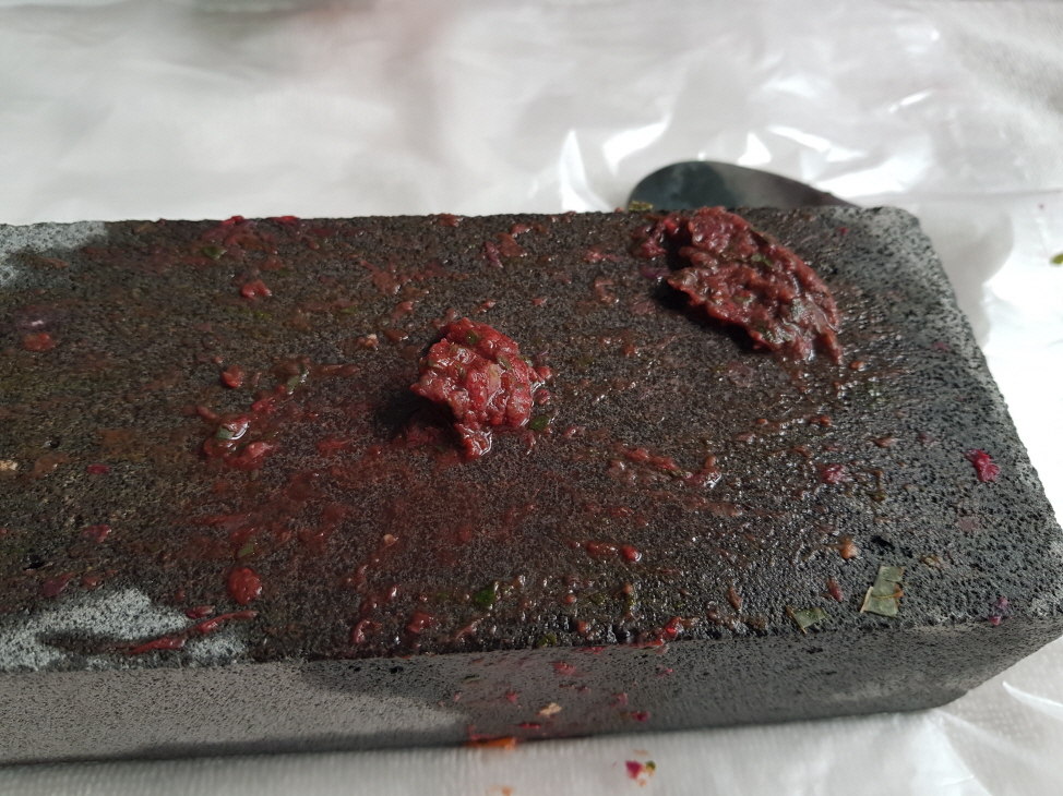 다 찧고 나니 봉숭아 꽃잎이 이렇게 조금만 덩어리로 변했다. 생각보다 양이 적었는데 아이 손톱에 물을 들이기에는 충분한 양이다.