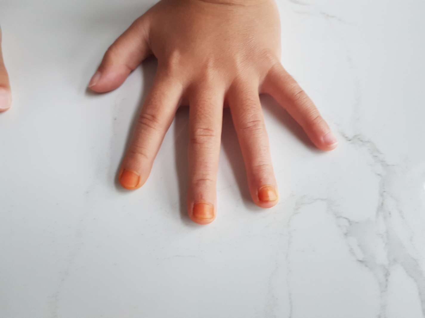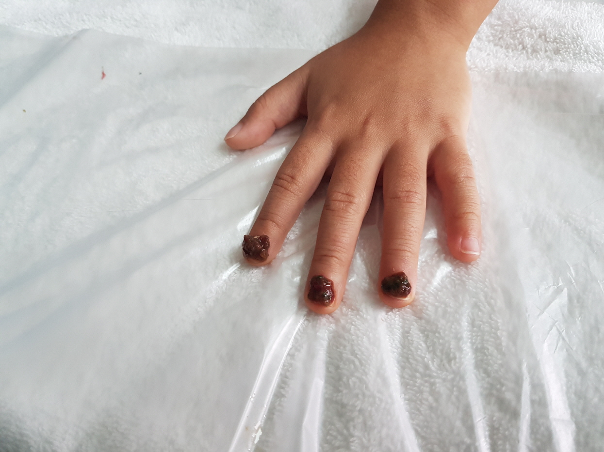 양쪽 손톱 모두 불이 예쁘게 잘 들었다. 마치 메니큐어를 바른 듯 손가락에는 물이 들지 않고 손톱에만 가지런이 예쁘게 들었다.