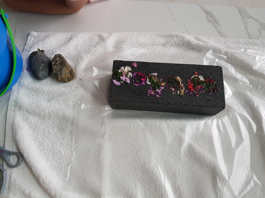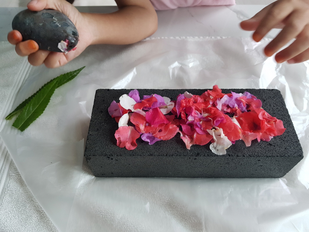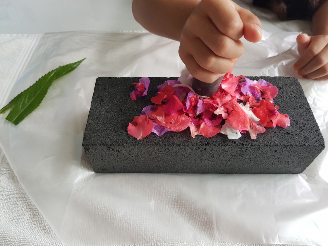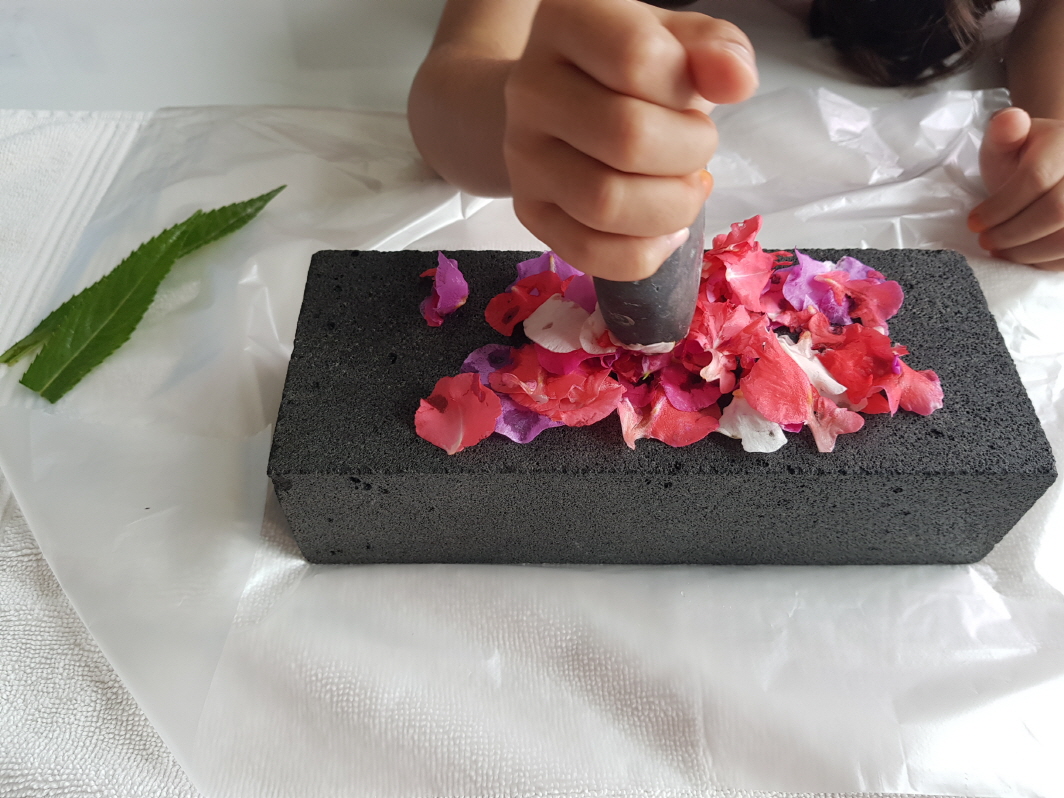 절구가 없어서 벽돌위에 꽃잎을 올려놓고 찧는다.