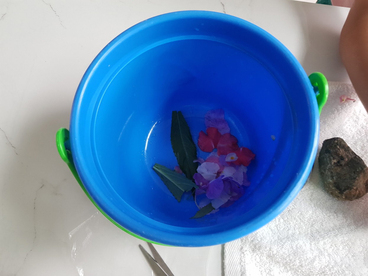 꽃잎을 찧으며 중간에 봉숭아 잎도 넣어서 같이 찧는다. 돌이 부딪히는 콩콩콩 소리도 재밌고 꽃잎이 으깨지며 만져지는 촉감도 재밌다.