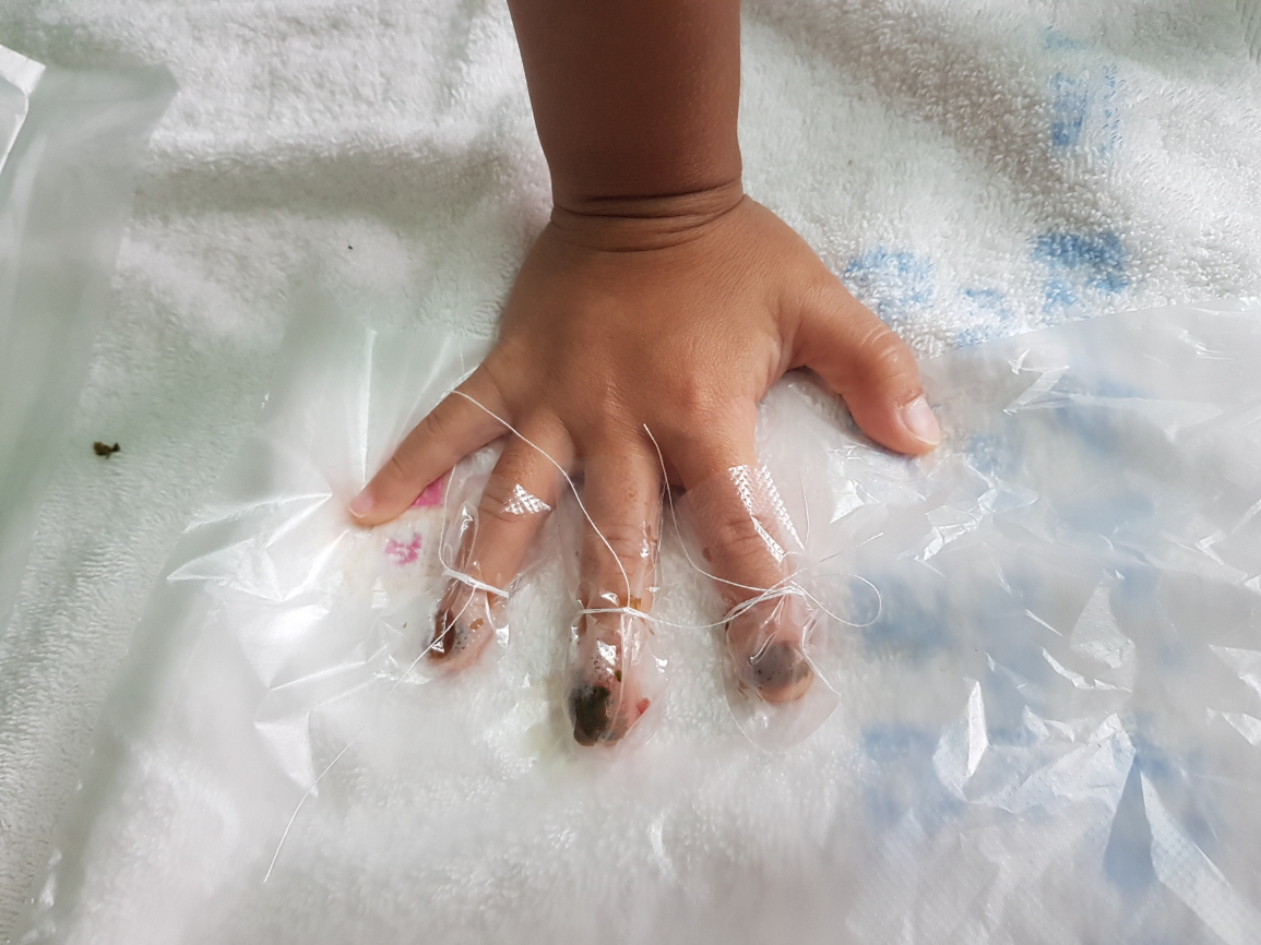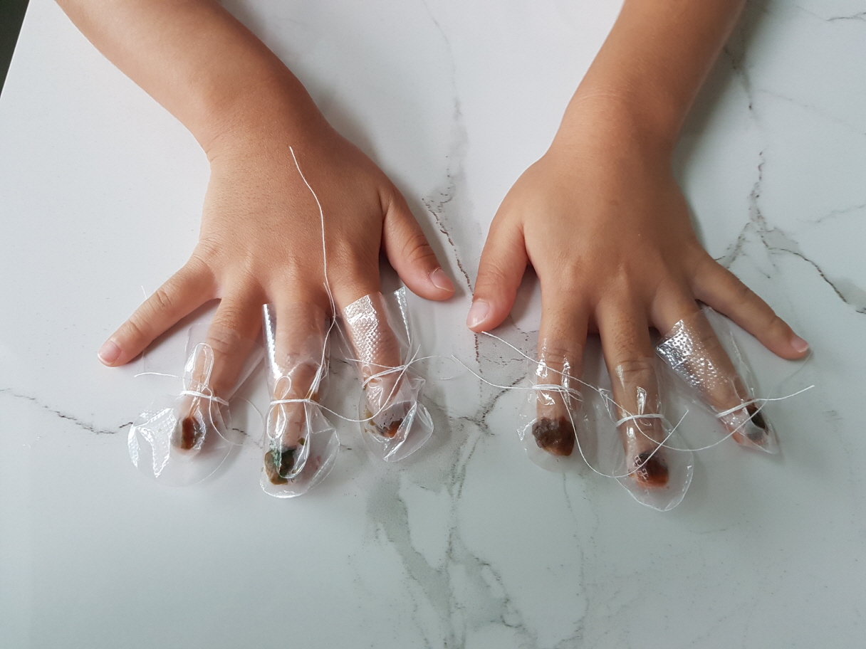 엄지와 새끼손가락을 뺀 세손가락에만 물을 들이기로 한다. 봉숭아를 올리고 준비한 비닐을 씌운뒤 실로 묶어 준다.