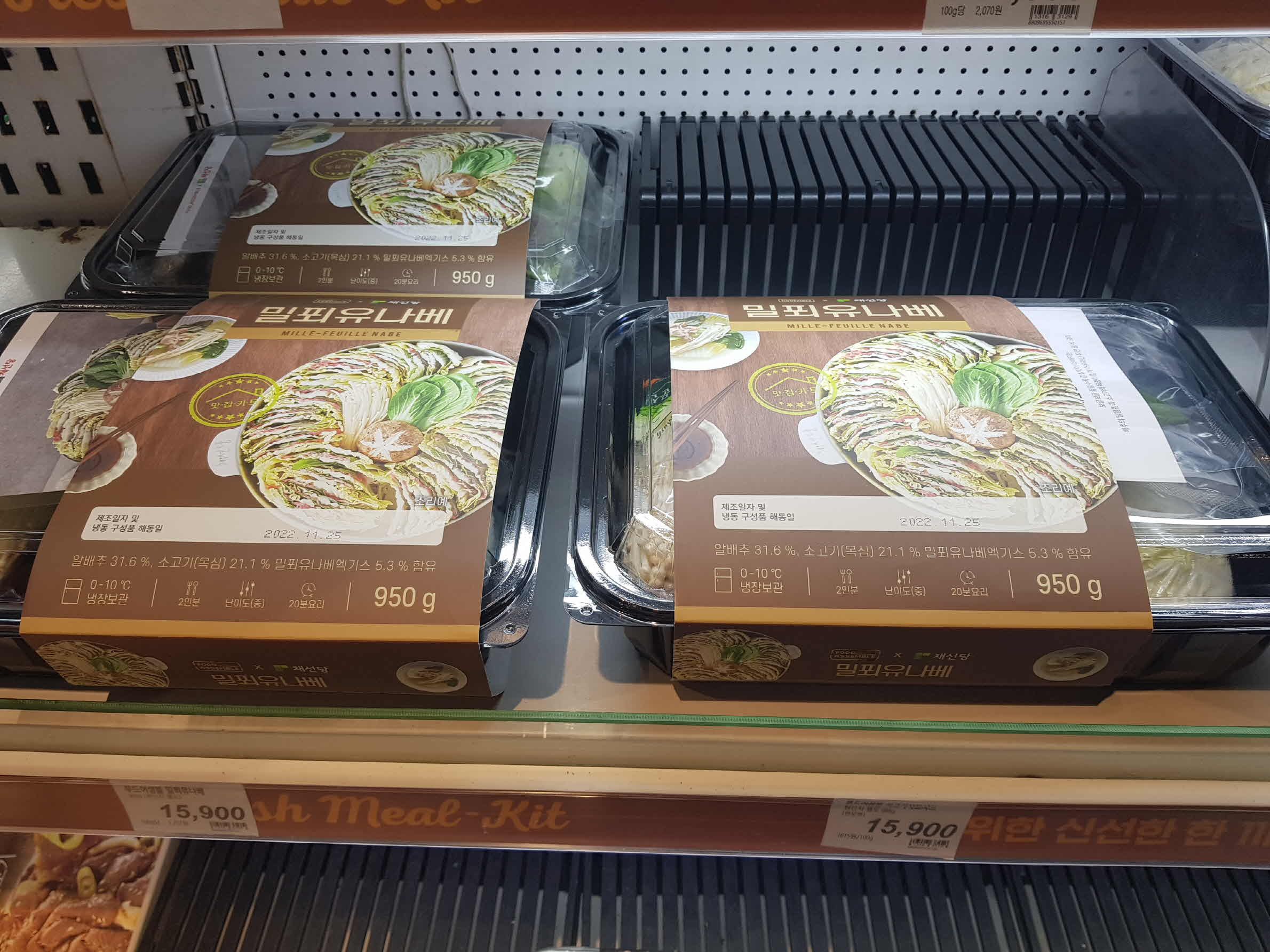 야채를 골라담고 있는데 마침 밀푀유나베 밀키트가 진열되어있는 것이 보인다. 판매 중인 밀키트 가격은 2인분에 15,900원이다.