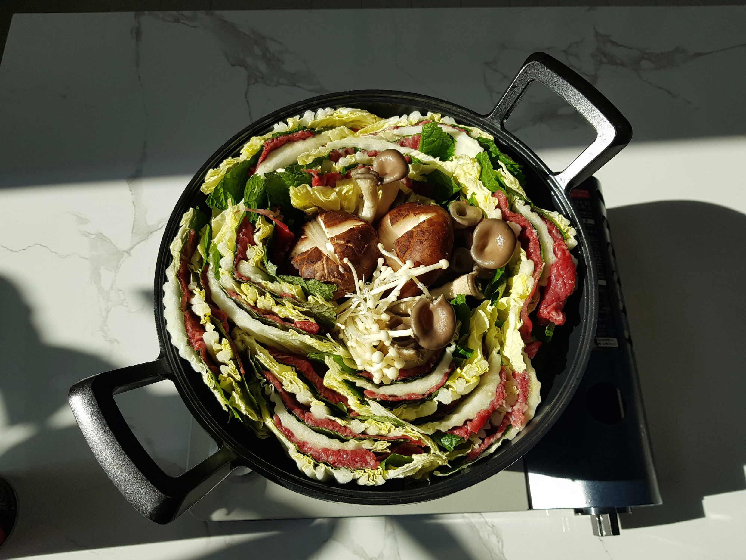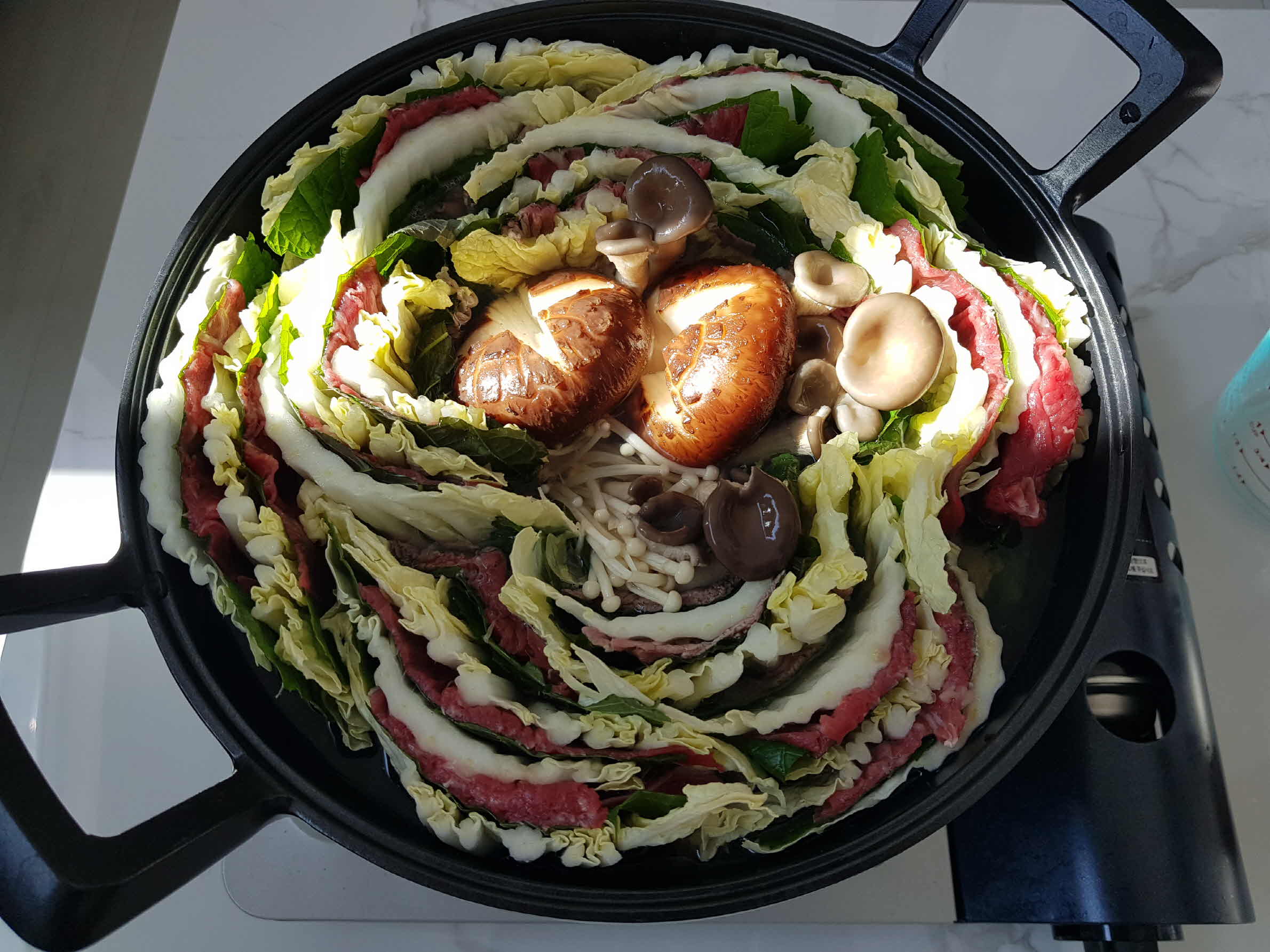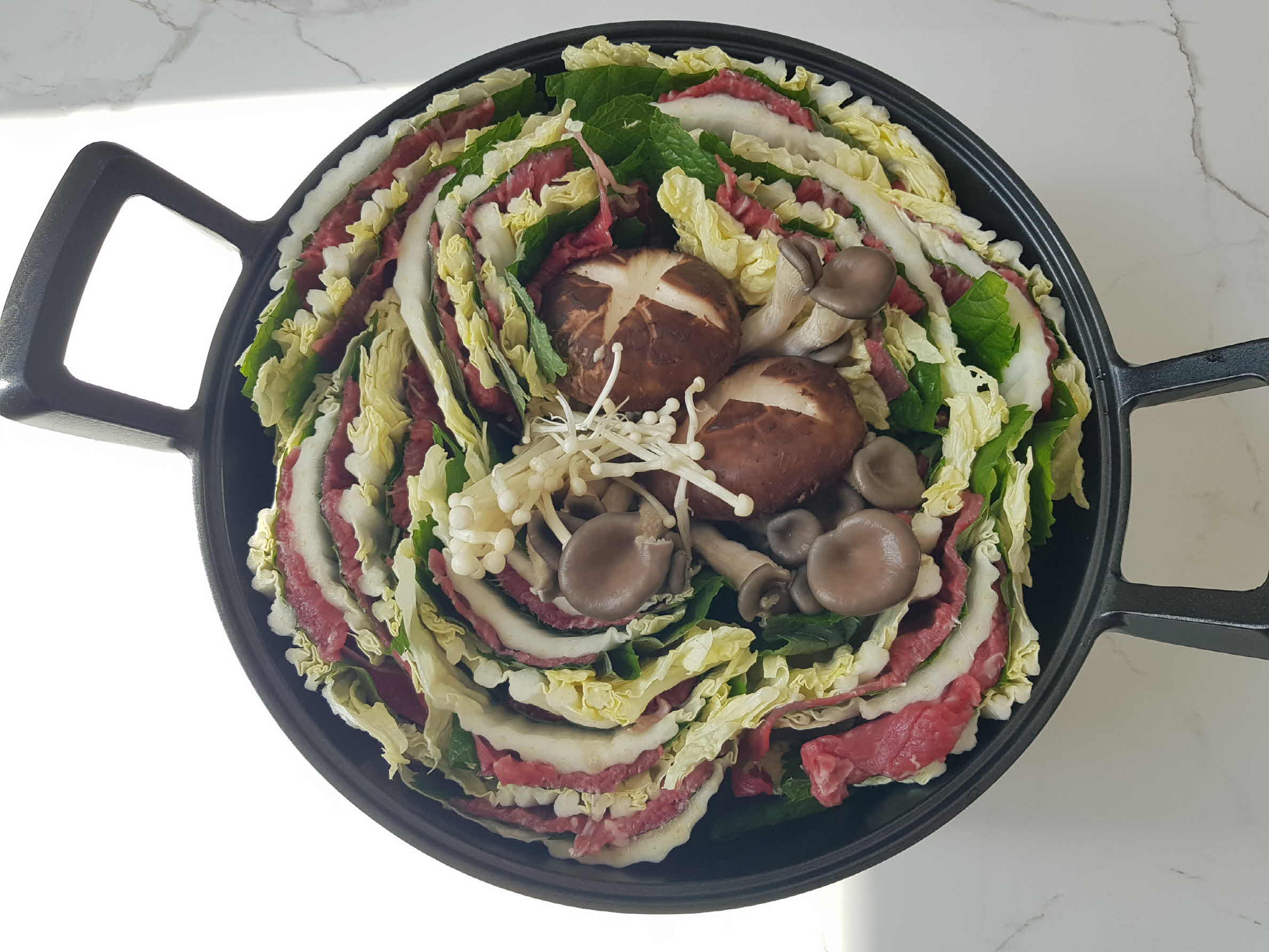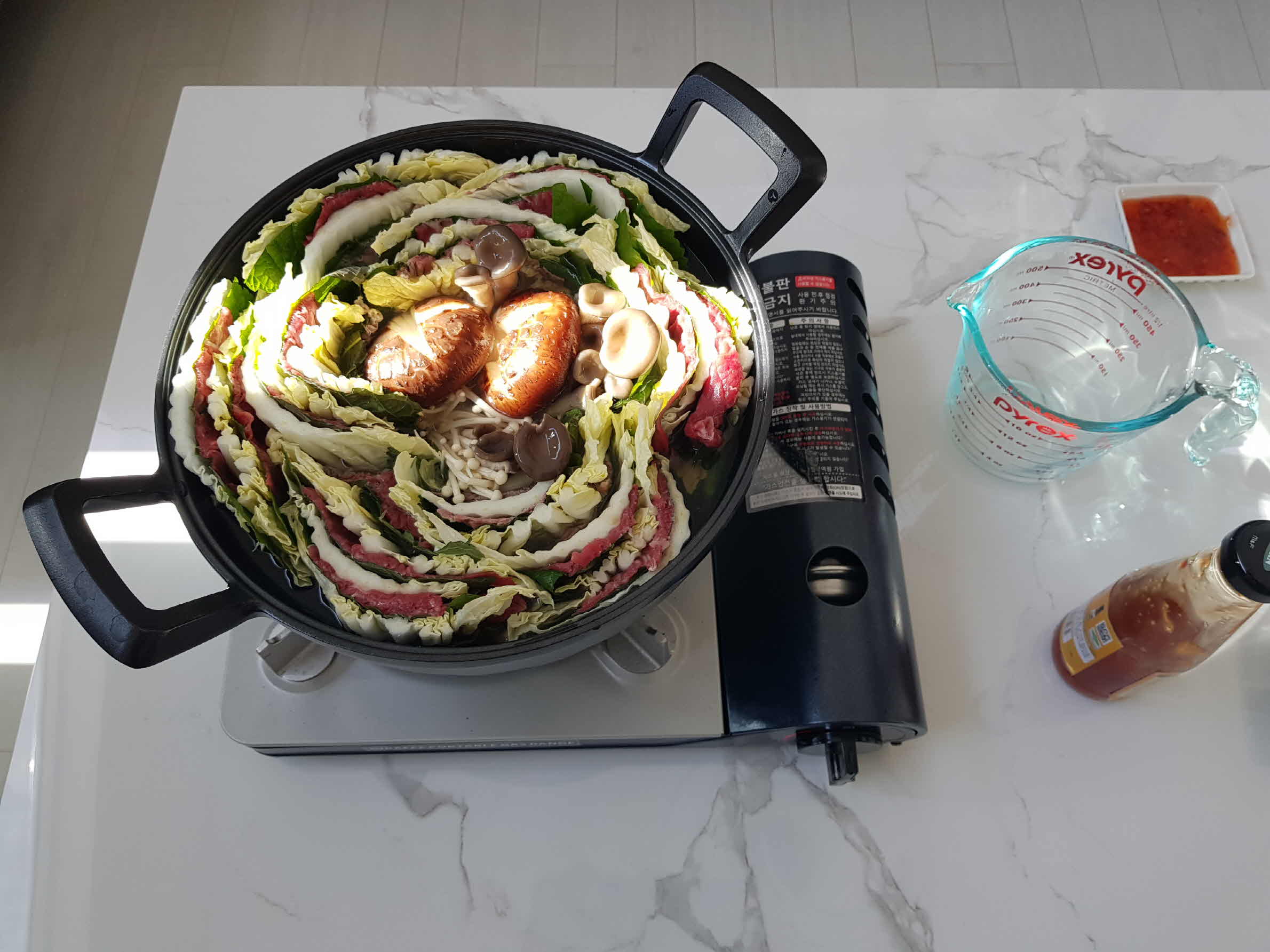 냄비에는 제일 아래 숙주를 깔아주고 그 위로 포개어 만든 알배추 + 깻잎 + 소고기를 아래와 같이 냄비에 보기 좋게 담아 준다.