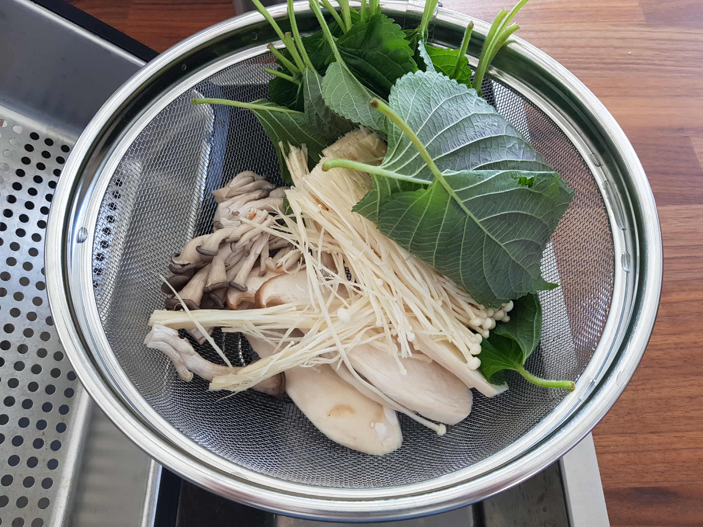 모양을 예쁘게 내기 위해서 표고버섯은 칼로 열십자로 파내 주고 가운데 남는 공간에는 팽이버섯과 느타리버섯으로 채워 넣는다.
