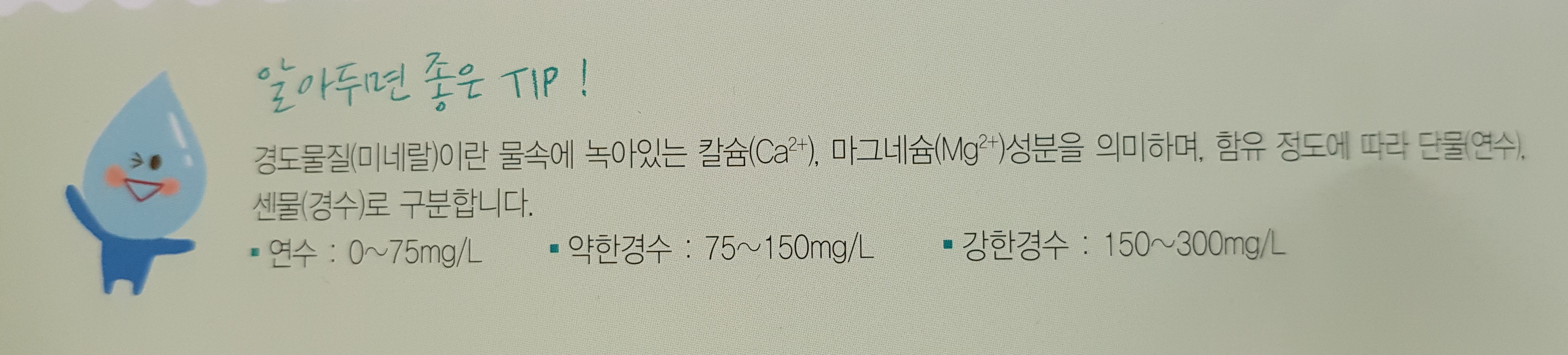 알아두면 좋은 팁! 경도물질(미네랄)이란 물속에 녹아있는 칼슘(CA), 마그네슘(MG) 성분을 의미하며 함유 정도에 따라 단물(연수), 쎈물(경수)로 구분한다. - 연수: 0 ~ 75mg/L - 약한경수: 75 ~ 150 mg/L - 강한경수: 150 ~ 300 mg/L |