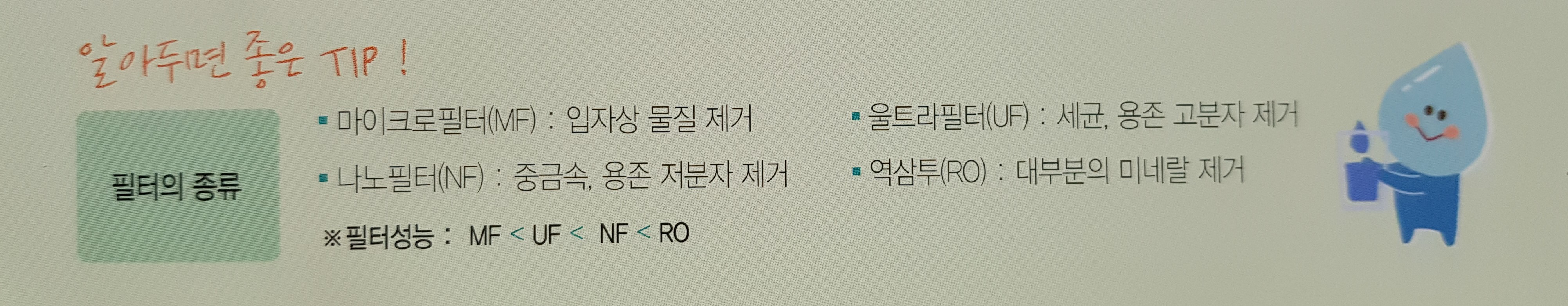 - 마이크로필터(MF): 입자상 물질 제거     ㅣ  - 울트라필터(UF): 세균, 용존 고분자 제거