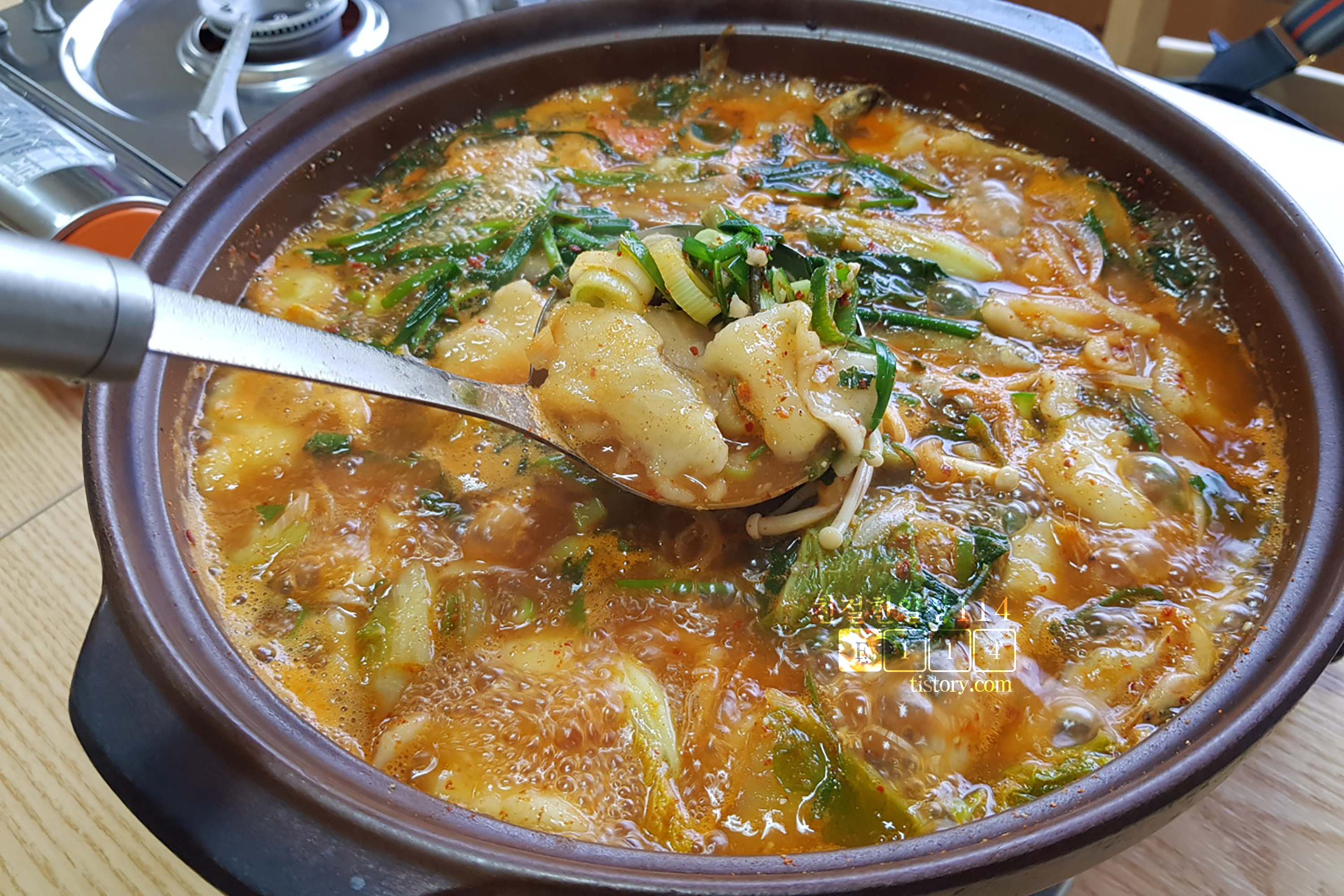 국자로 휘휘 저어서 섞은 뒤 한번 푹 끓인 다음 먹으면 된다.