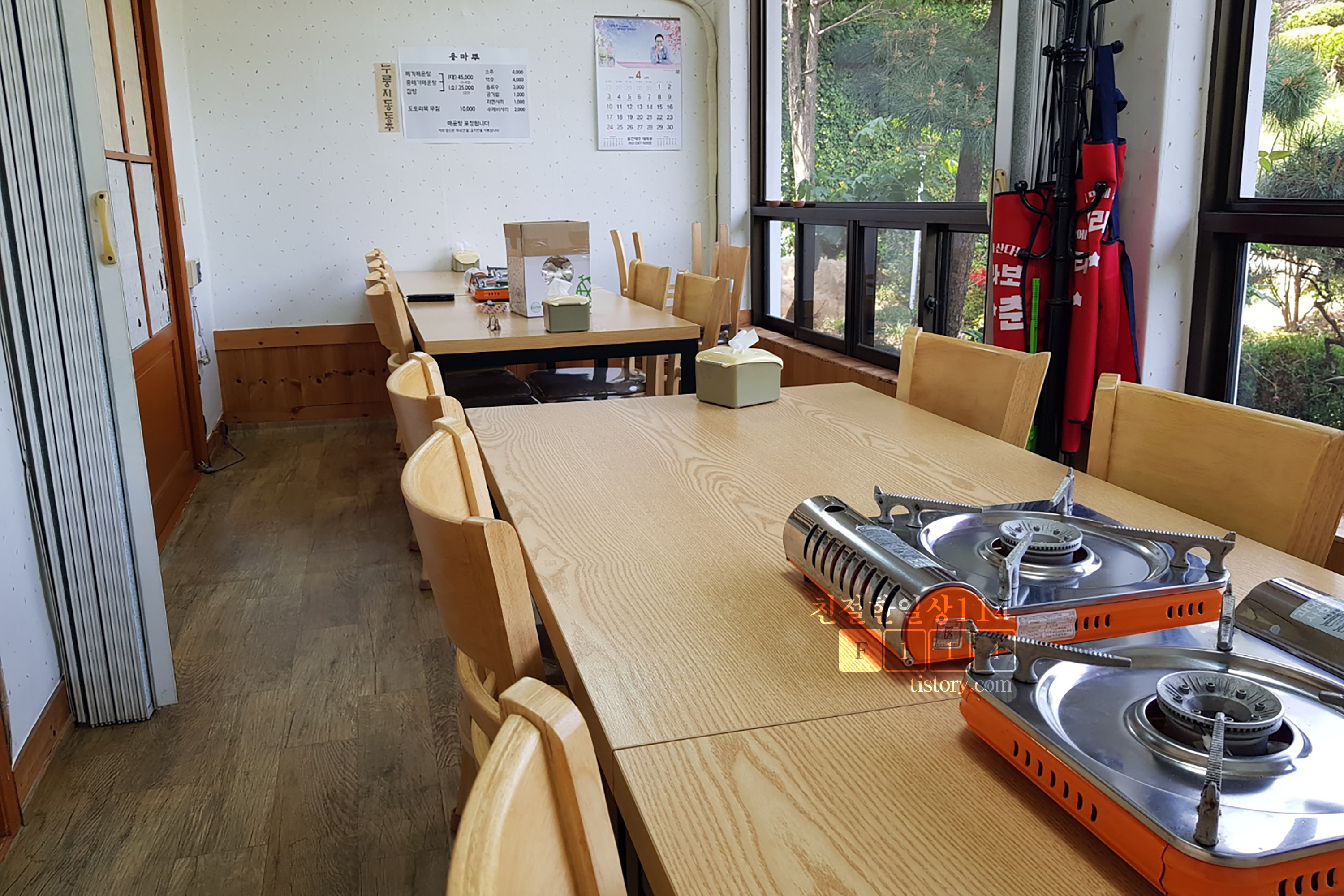 건물 밖에서도 알수 있었듯이 실내도 상당히 넓다. 목조건물인듯 건물 내외 부 곳곳에 나무로 된 부분과 가구가 많이 보인다. 식당 내부 중앙을 중심으로 둘러서 방이 칸칸이 있다. 방은 방석을 깔고 앉는 테이블과 의자가 놓여있는 테이블이 있다. 편한곳을 골라서 들어간다.