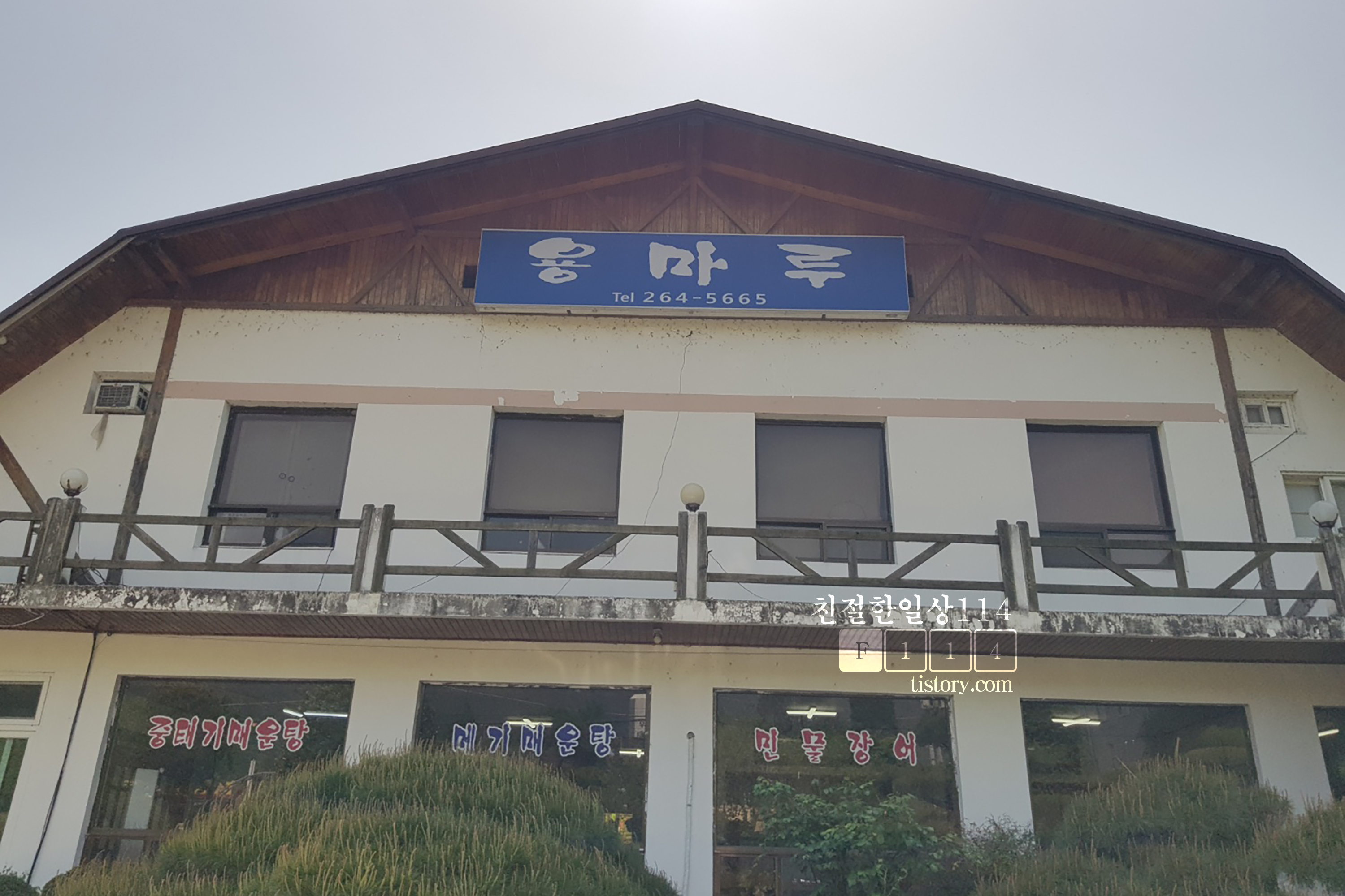 주차장에서 올려다본 용마루 식당 건물이다. 2층으로 지어져 있으며 1층 창문에 메뉴가 붙여져 있다. 중태기매운탕, 메기매운탕, 민물장어. 예전에는 민물장어도 메뉴에 었었는지 모르겠지만 이번에 본 식당 메뉴에서는 민물장어는 없었다.