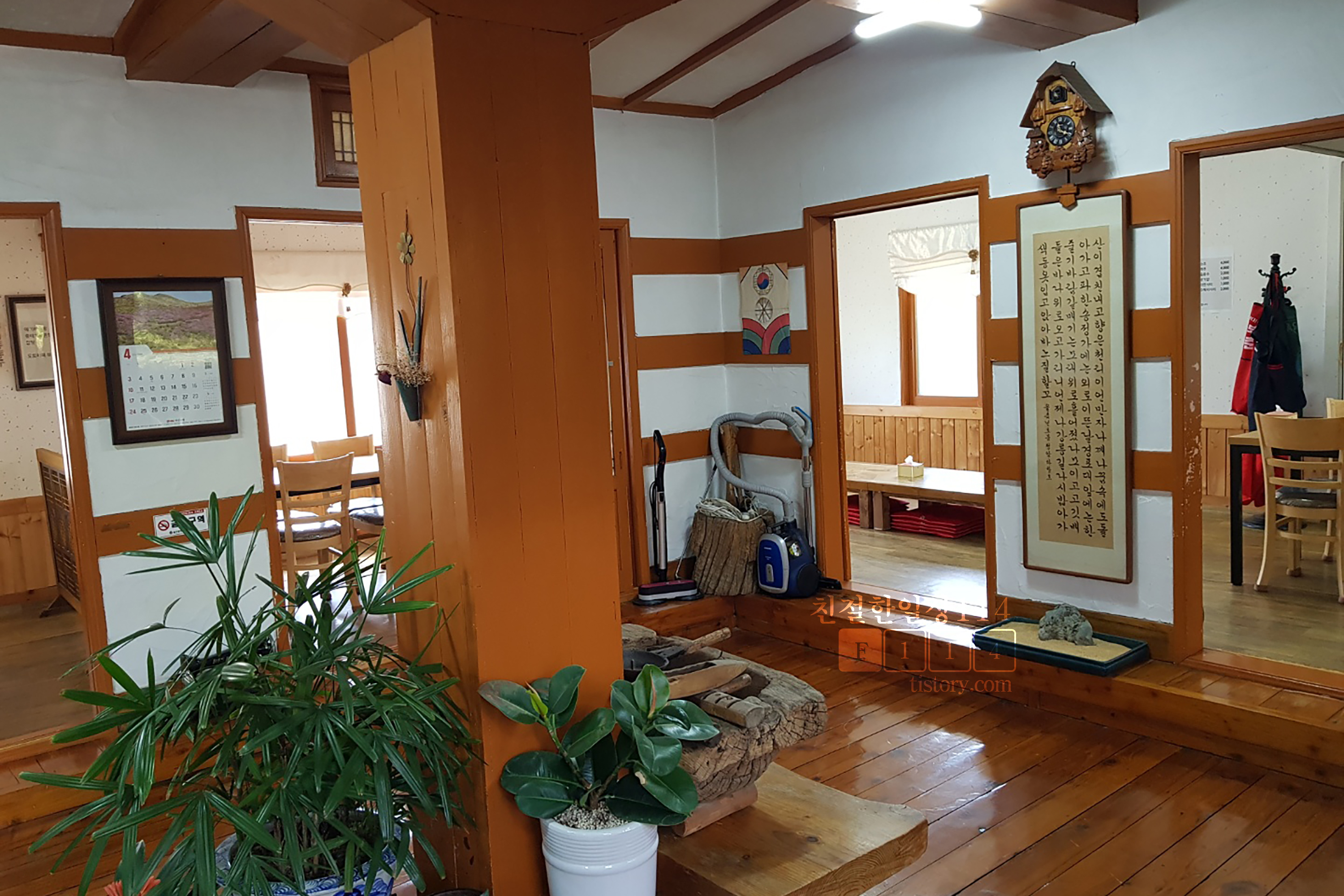 건물 밖에서도 알수 있었듯이 실내도 상당히 넓다. 목조건물인듯 건물 내외 부 곳곳에 나무로 된 부분과 가구가 많이 보인다. 식당 내부 중앙을 중심으로 둘러서 방이 칸칸이 있다. 방은 방석을 깔고 앉는 테이블과 의자가 놓여있는 테이블이 있다. 편한곳을 골라서 들어간다.