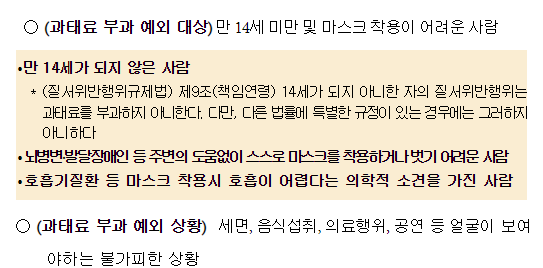 •  과태료 부과 예외 상황: 세면, 음식섭취, 의료행위, 공원 등 얼굴이 보여야 하는 불가피한 상황