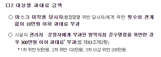 - 마스크 미착용 당사자: 위반 횟수와 관계 없이 10만원 이하 과태료 부과
