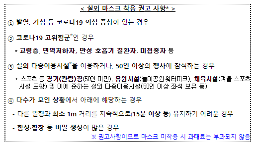 * 이밖의 실외에서는 의무 착용이 해제되며 의무상황 외에도 실외 마스크 착용이 권장 되는 경우는 착용을 권고하고 있다. (실외 마스크 착용 권고사항은 아래 참조)
