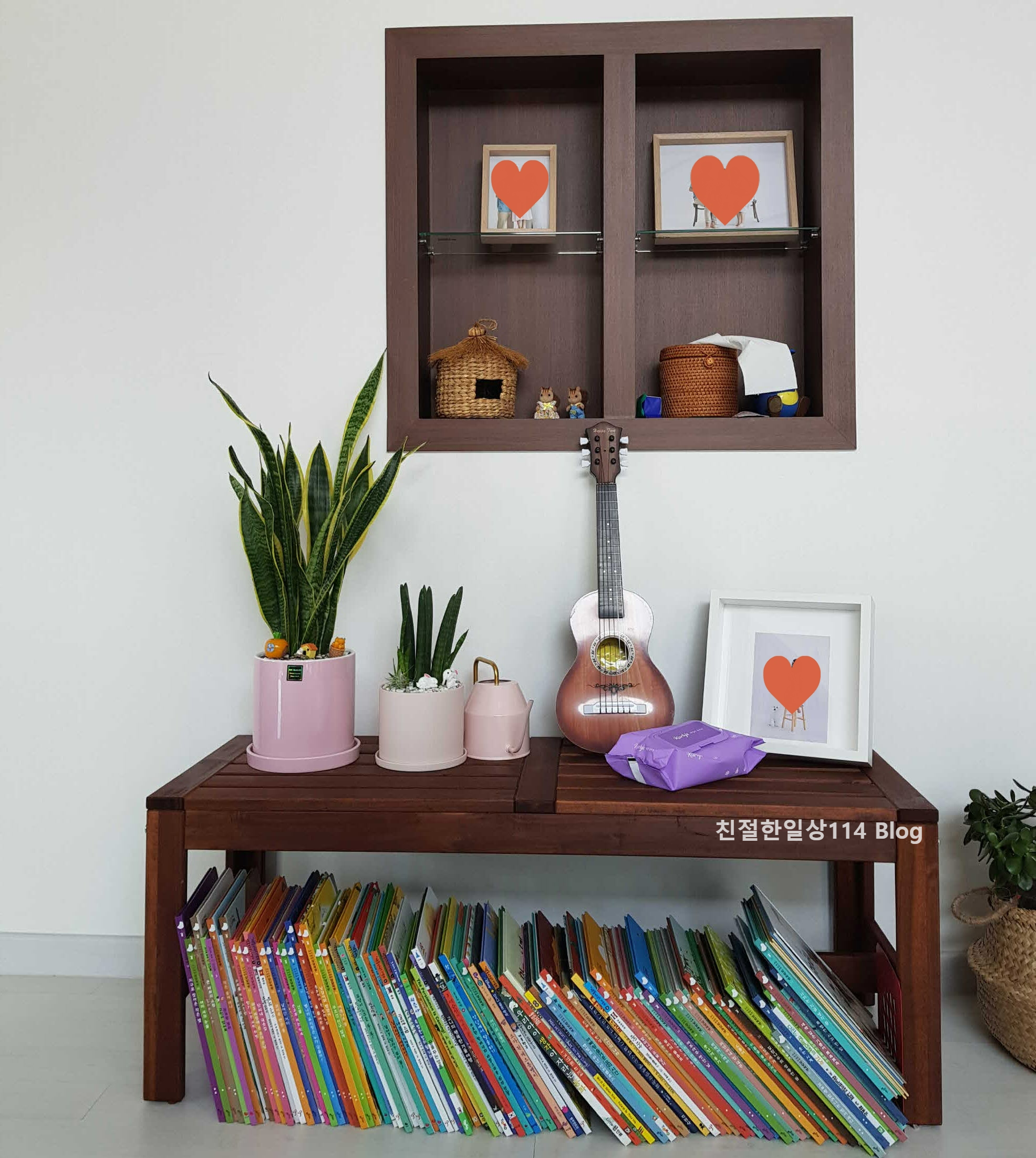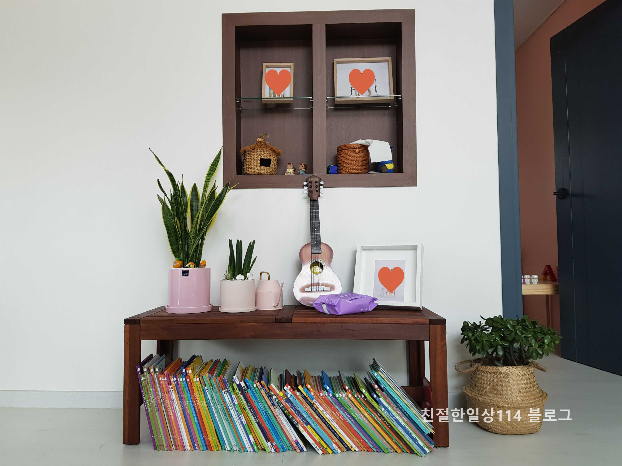 주로 장식품이나 액자를 올려놓지만 한칸에는 자주 쓰는 물건을 올릴 수 있는 공간으로 쓰며 탁자나 TV장 위가 어지렵혀 지는 것을 막아준다.