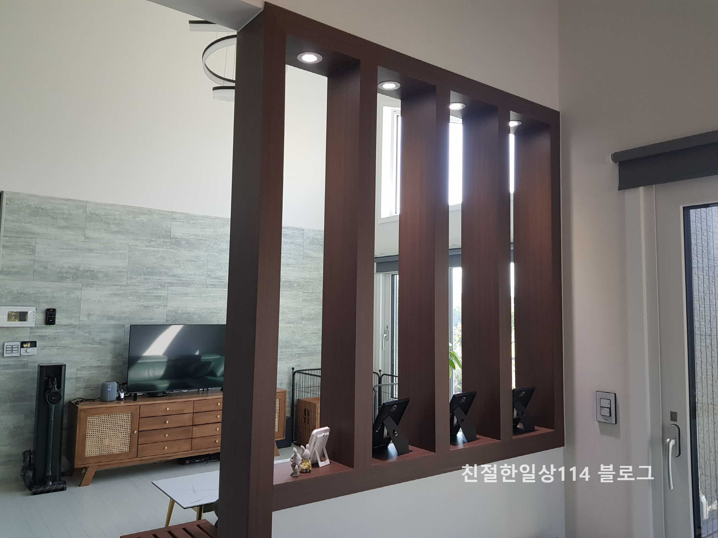 여타의 집과 달리 우리집은 거실과 주방이 따로 있다. 이러다 보니 거실은 다른 실로 통하는 복도를 제외하고 사방이 막혀 있다. 자칫 답답해 보일 수 있어서 거실과 주방(다이닝룸) 사이의 벽을 가벽으로 만들었다.